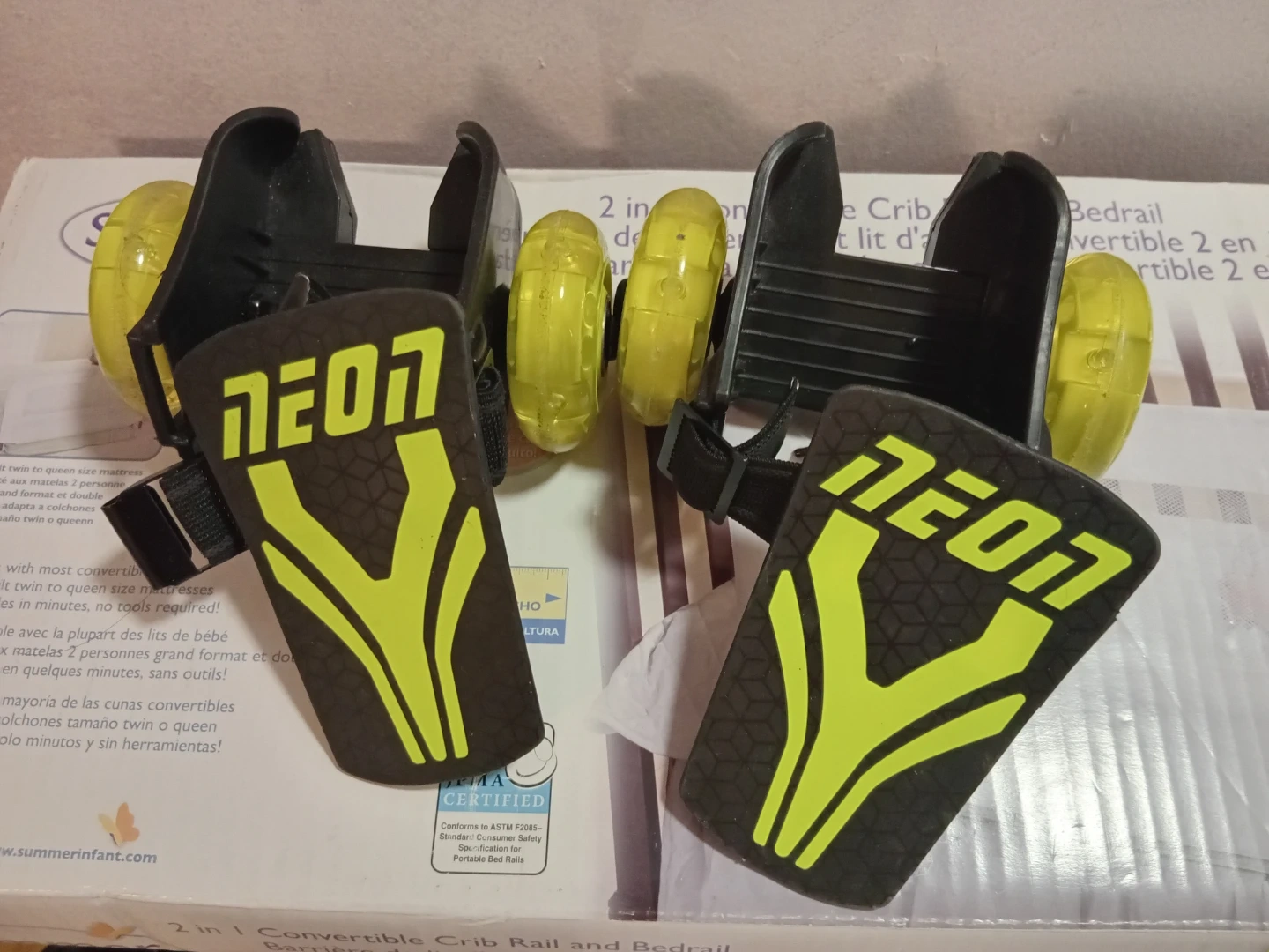 NEON inline roller skates for shoes with bright yellow wheels. They easily strap onto most shoes. Straps are adjustable for a secure fit. Perfect for kids learning to skate!