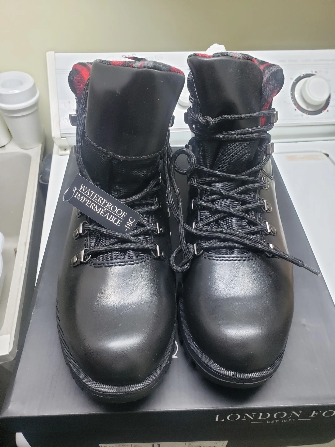 Selling a pair of London Fog Brutus Winter boots in black, size 11! These boots are waterproof and come with the original box. The inside lining features a red and black plaid design. Originally bought for $120