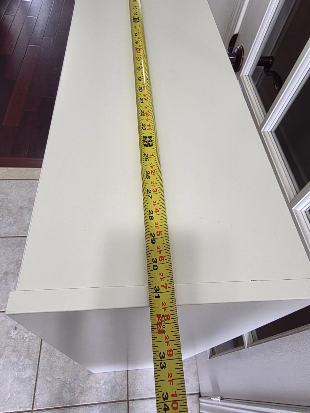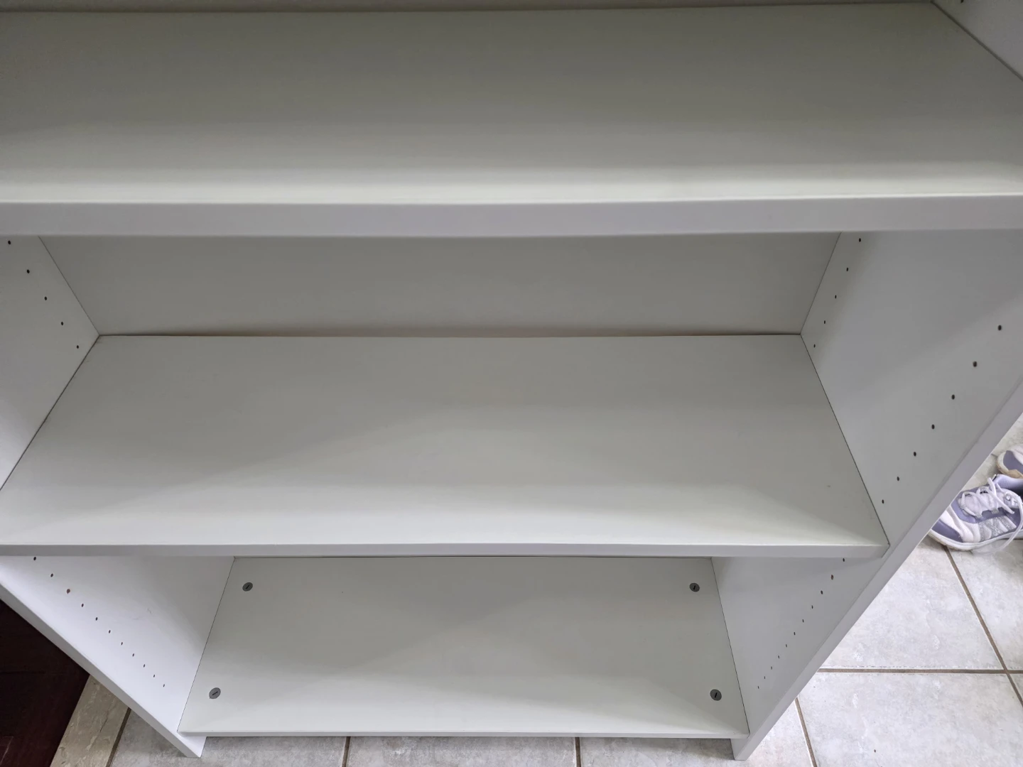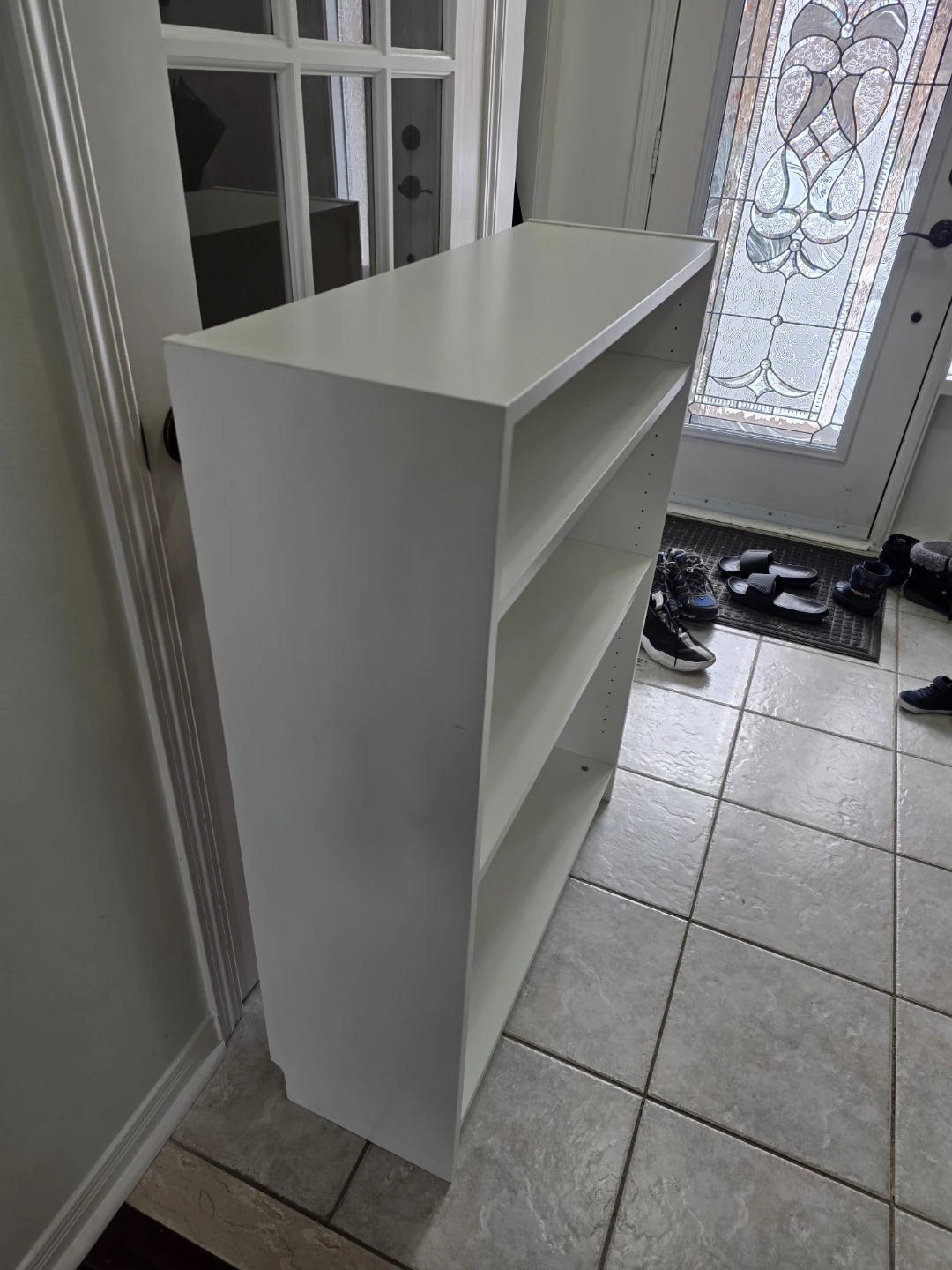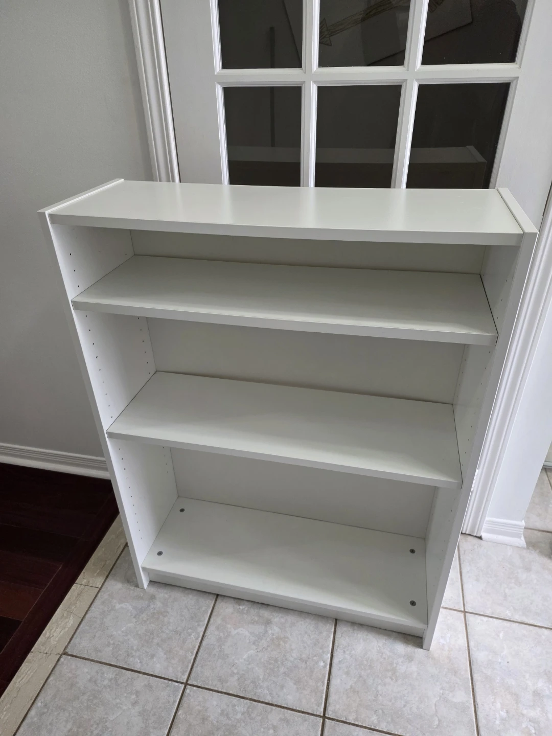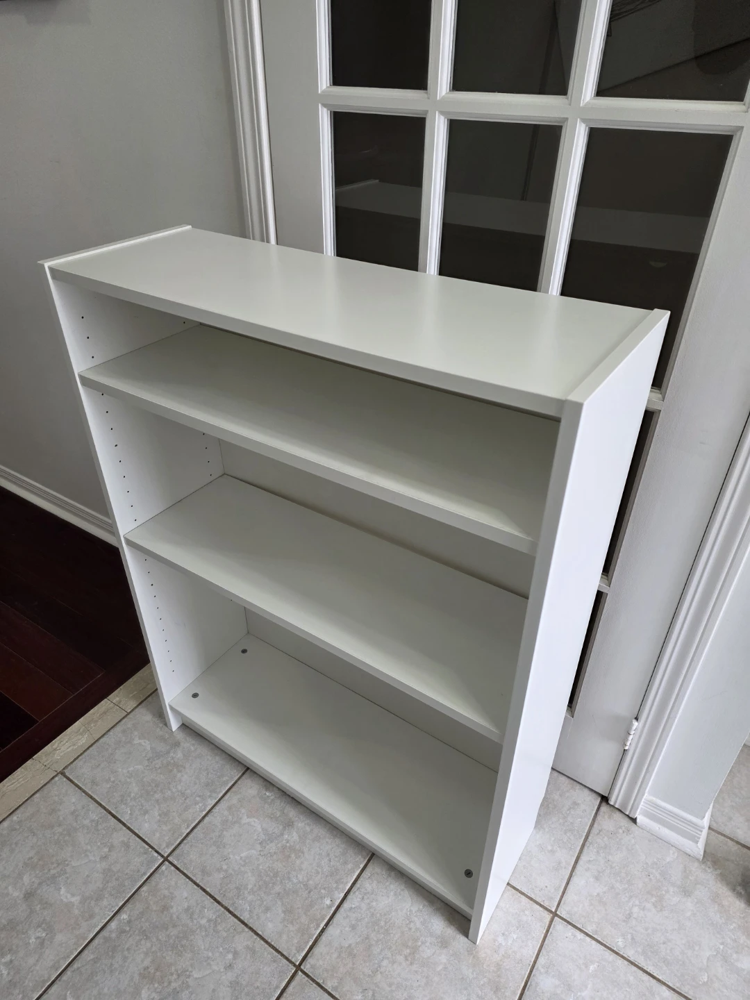 This white bookshelf has four shelves for storage. It's a great option for organizing books or displaying items. Made of composite wood.