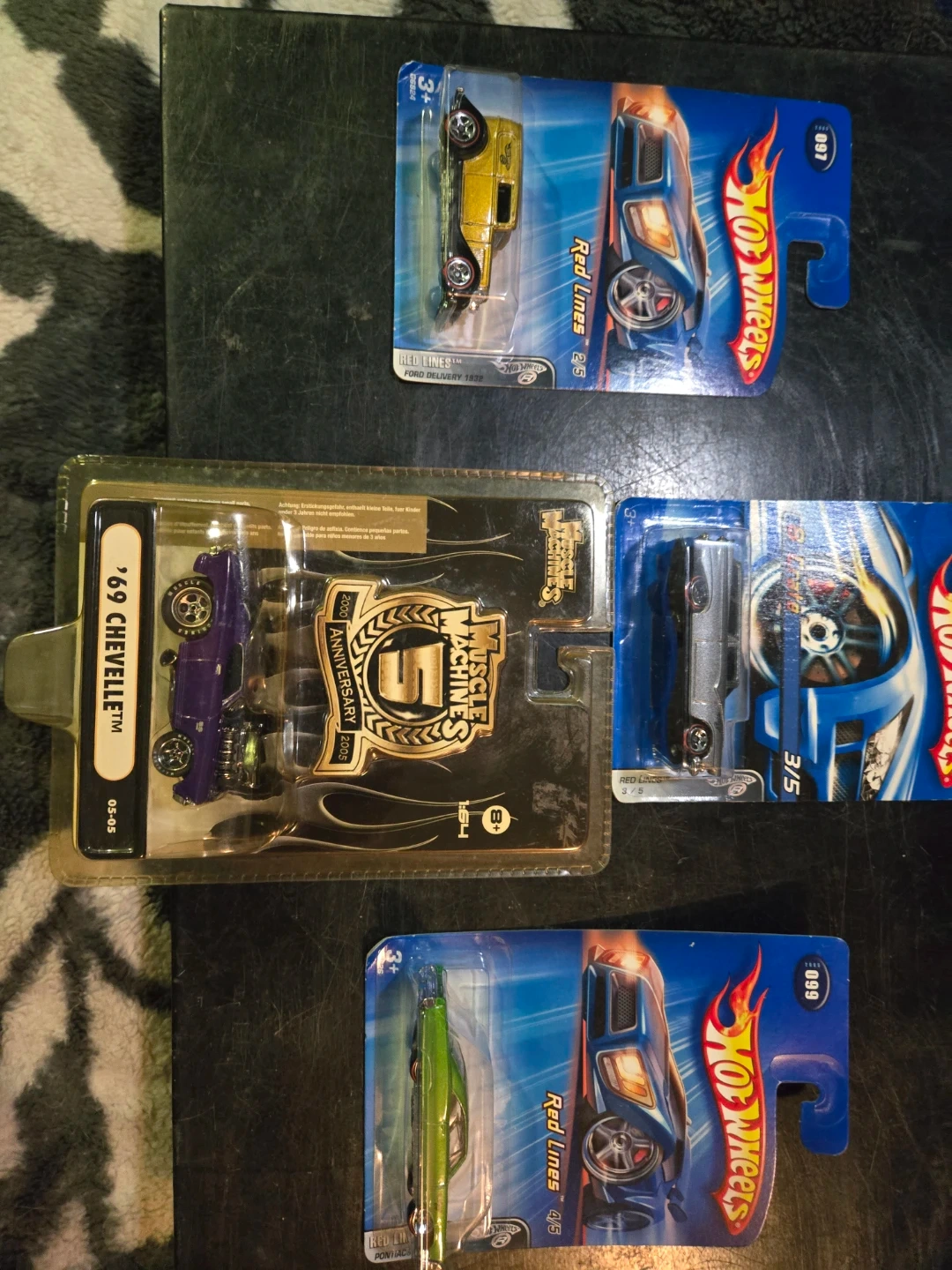 A collection of Hot Wheels die-cast cars. Includes Red Line series and a 50th Anniversary Muscle Car edition. $15 for each picture of cars or $30 for all.