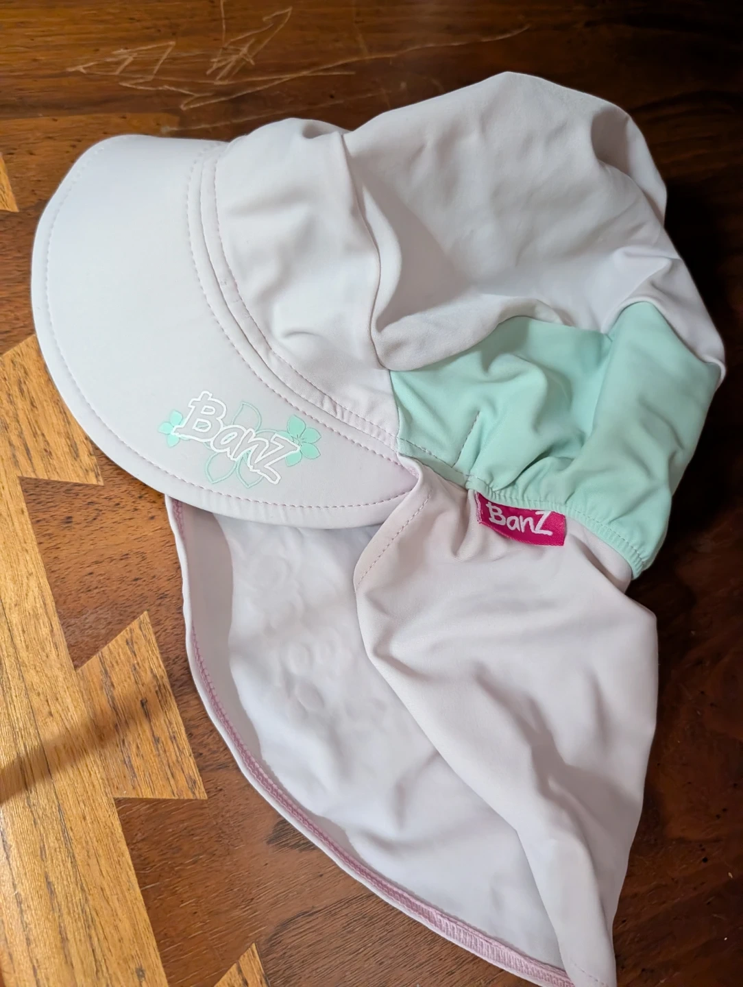 Banz UV sun hat with neck protection. Circumference 20-24". Made of 80% Nylon, 20% Lycra. Excellent for keeping kids sun-safe!