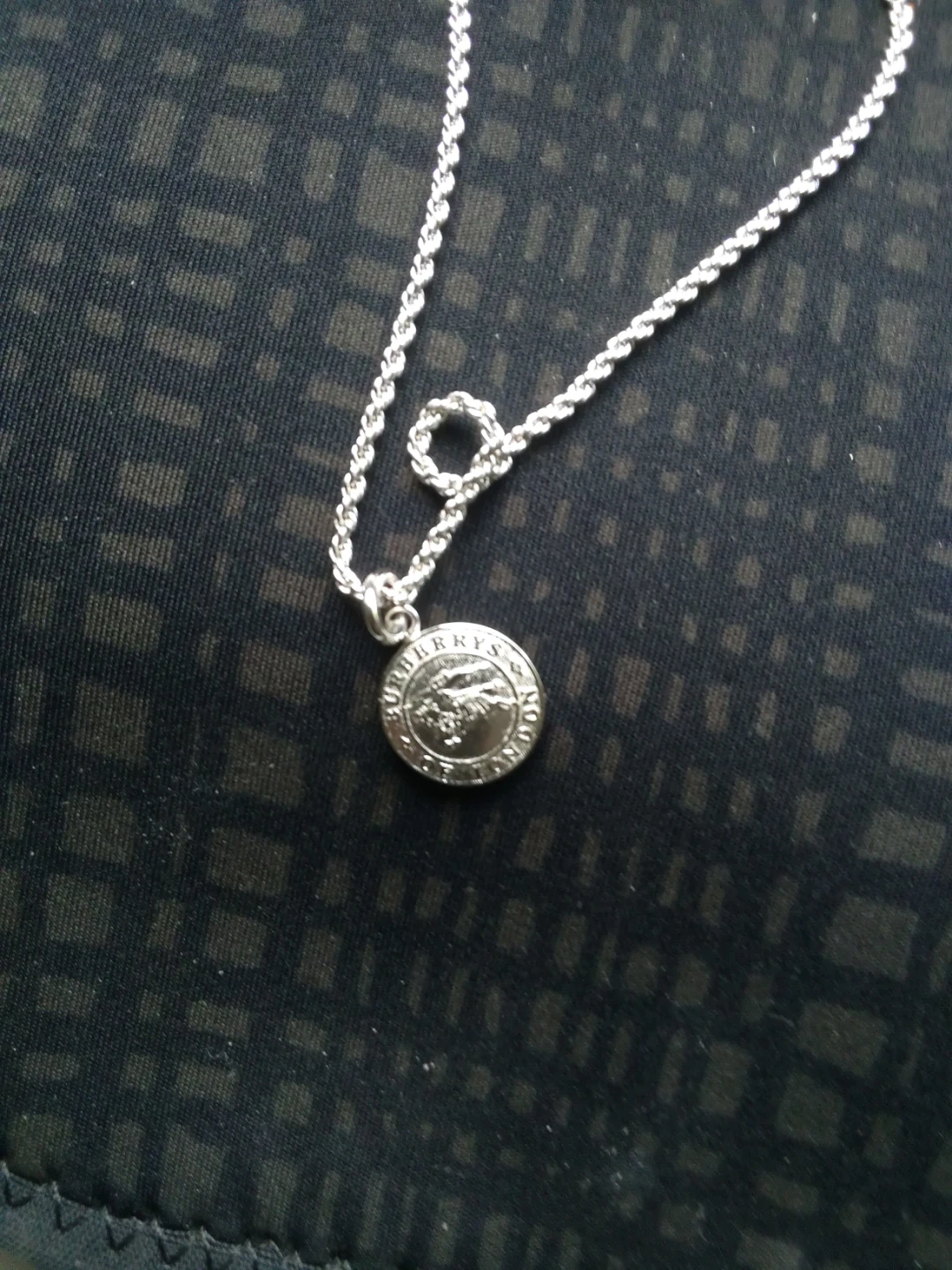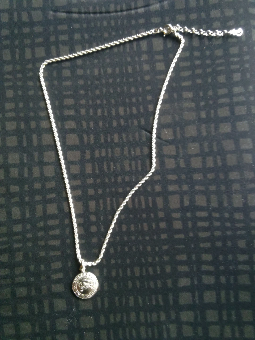 Buy & SellBurberry Silver Tone Pendant NecklaceBurberry Silver Tone Pendant Necklace$65Silver tone pendant necklace with a circular charm featuring the Burberry logo. It's adjustable for length. Chain length approximately 16 inches.ConditionGoodSize20"WHERE TO MEETCheck LocationView MapSELLERverifiedBrendaWilliamsburg1115 reviews0 chats·0 favorites·9 viewsSEND CHAT TO SELLERHi Brenda! I’m interested in your listing.Hi Brenda! I’m interested in your listing.Get the Karrot app to chatSign In to chat