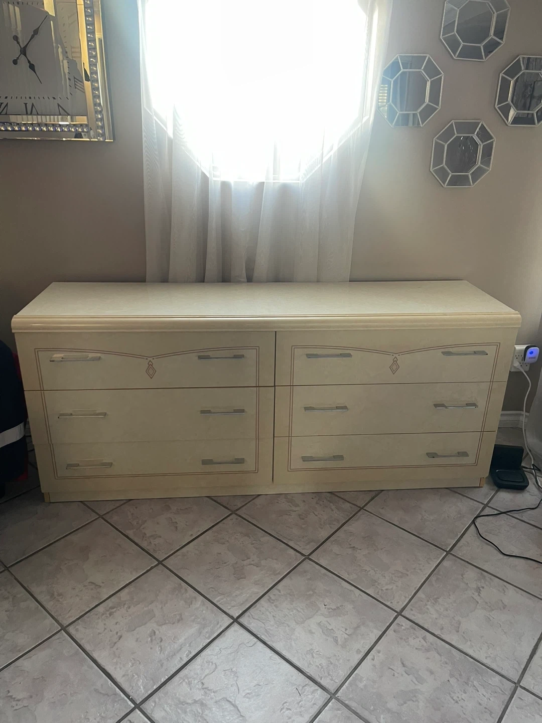 This cream dresser has six drawers for storage. It features a light wood tone with decorative trim and silver handles. It's a classic piece for any bedroom!