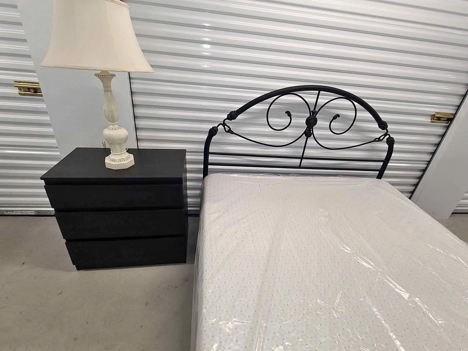 Beautiful shabby chic style queen size bedframe. Comes with a boxspring and like new condition ENDY Mattress, no stains, no rips. Pet and smoke free home. For asking price, a free dresser and lamp are included, as shown in images.