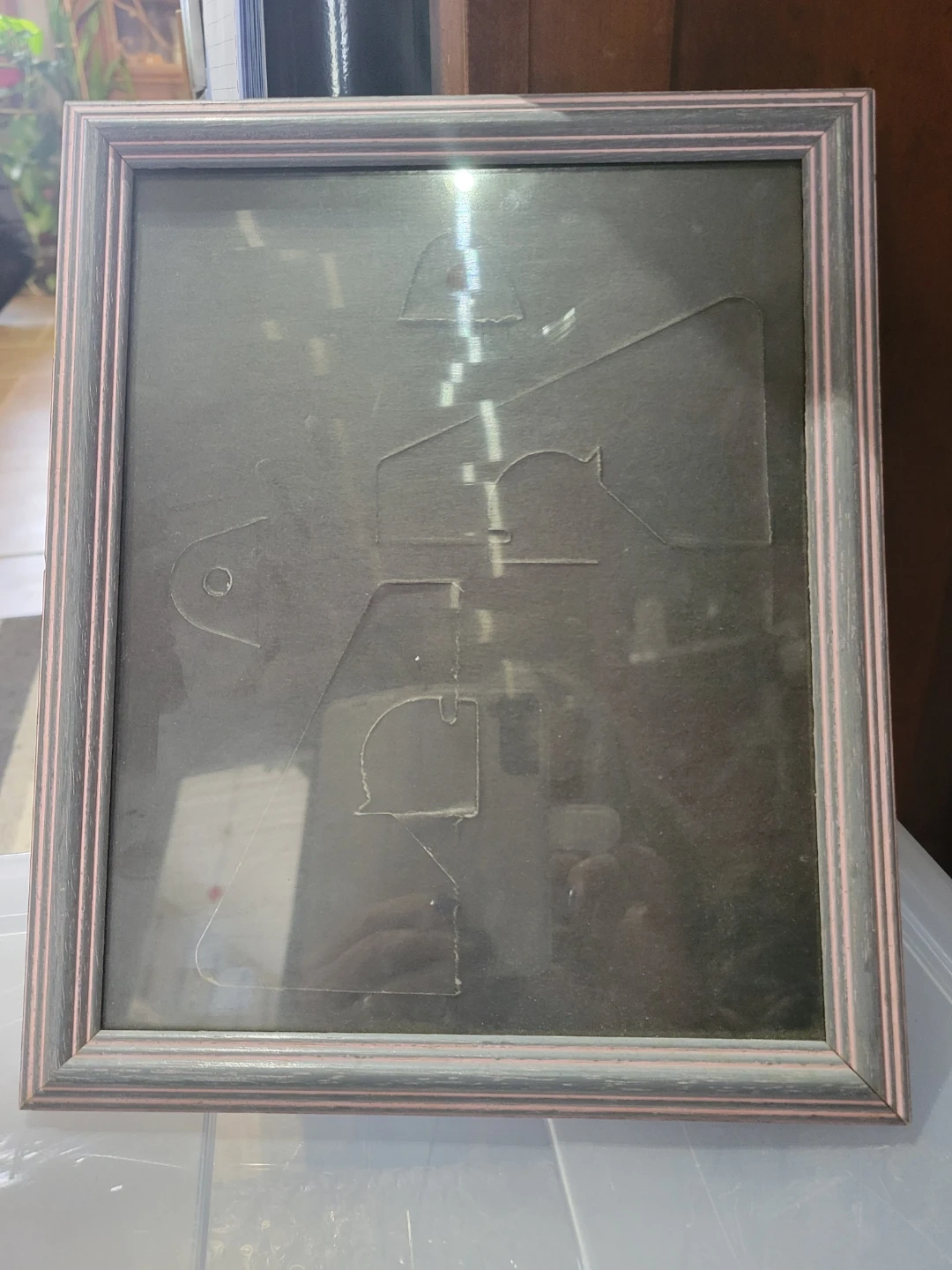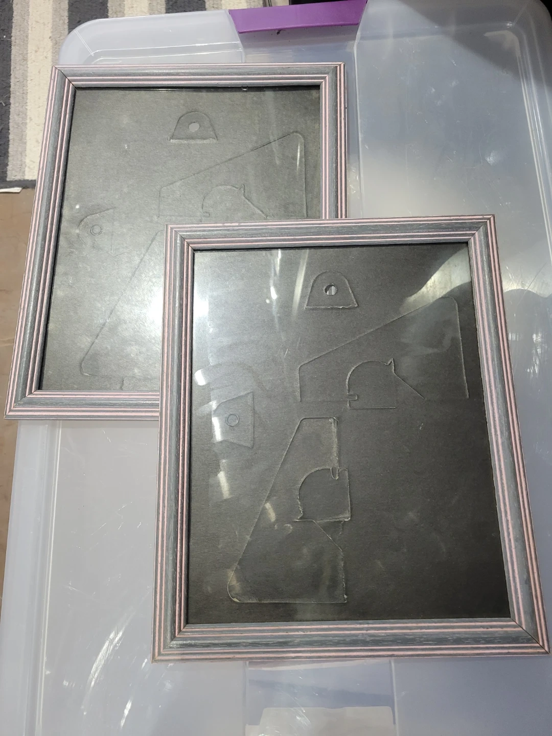 Two picture frames are included. Both frames are grey with pink accented distressed finish, and are real wood. Both frames have a black backing with cutouts for standing (not really used). Image area is 8 x 10, frame is a bit bigger. Good condition.