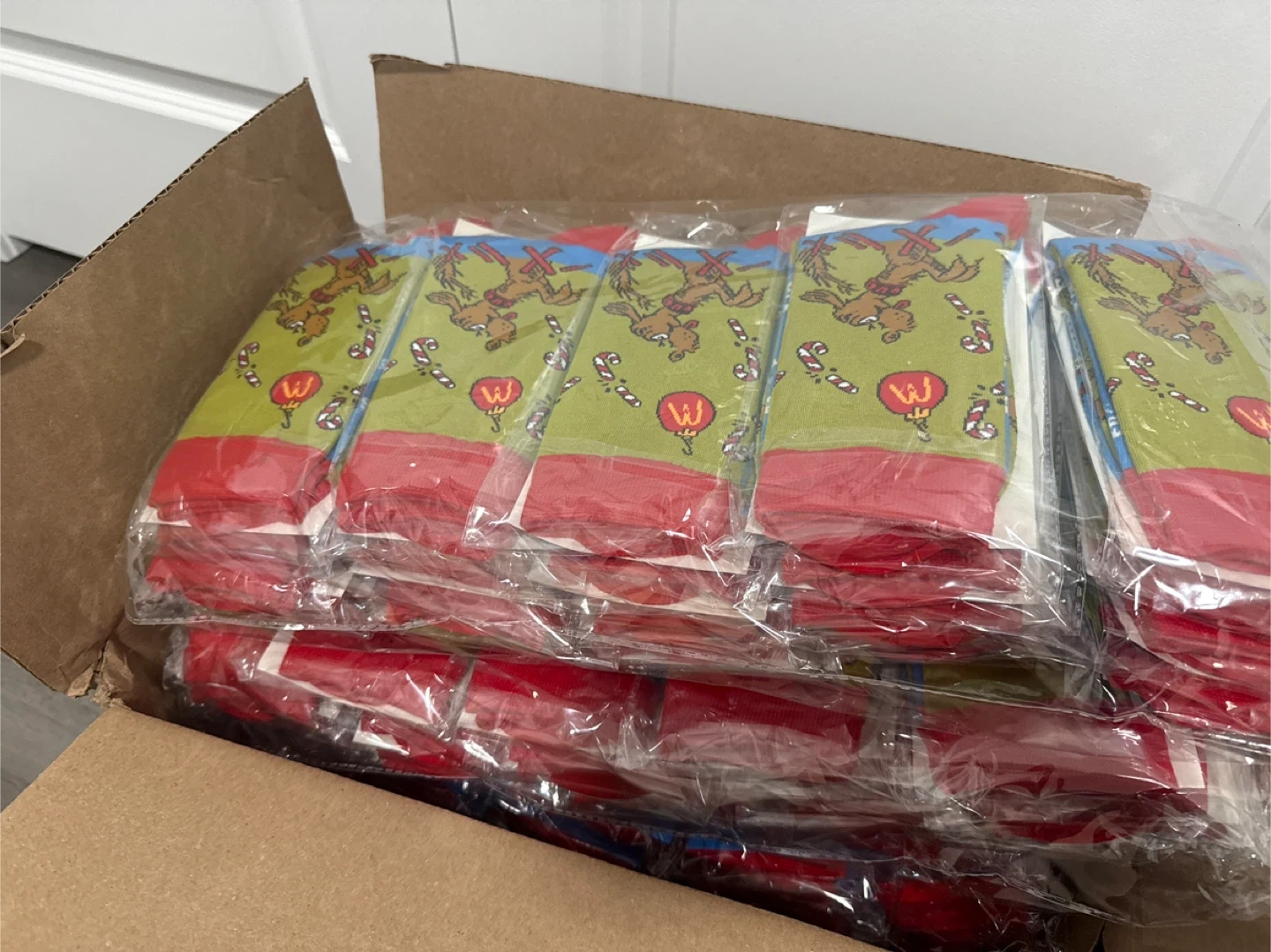 Bundle of 25 pair of socks featuring Grinch character design with candy canes and a red band. These socks have a green and red colour scheme. Perfect for adding some fun to your day or as a gift!