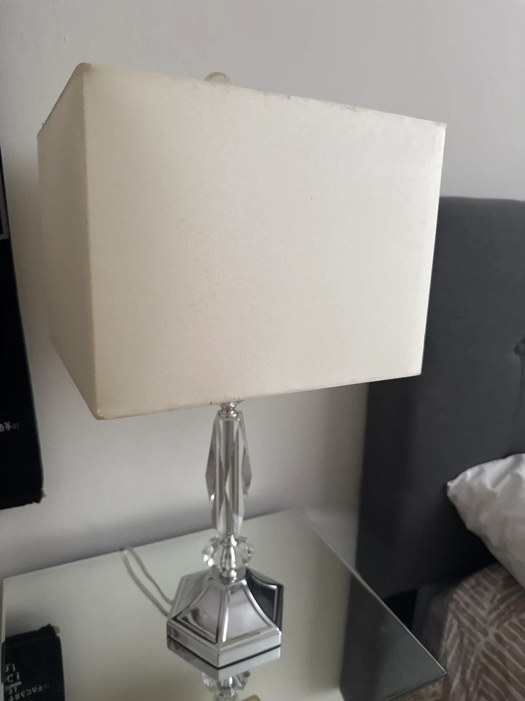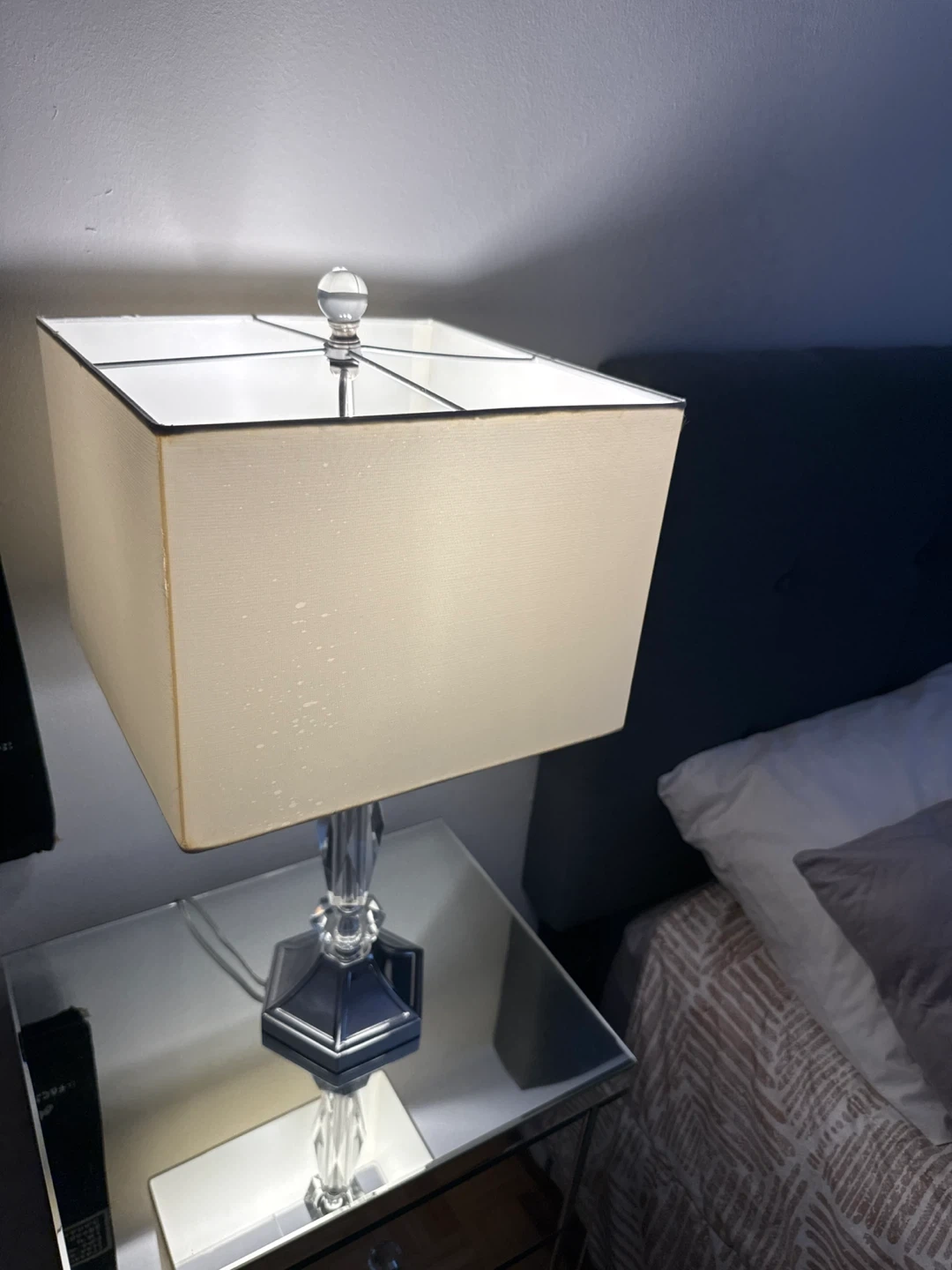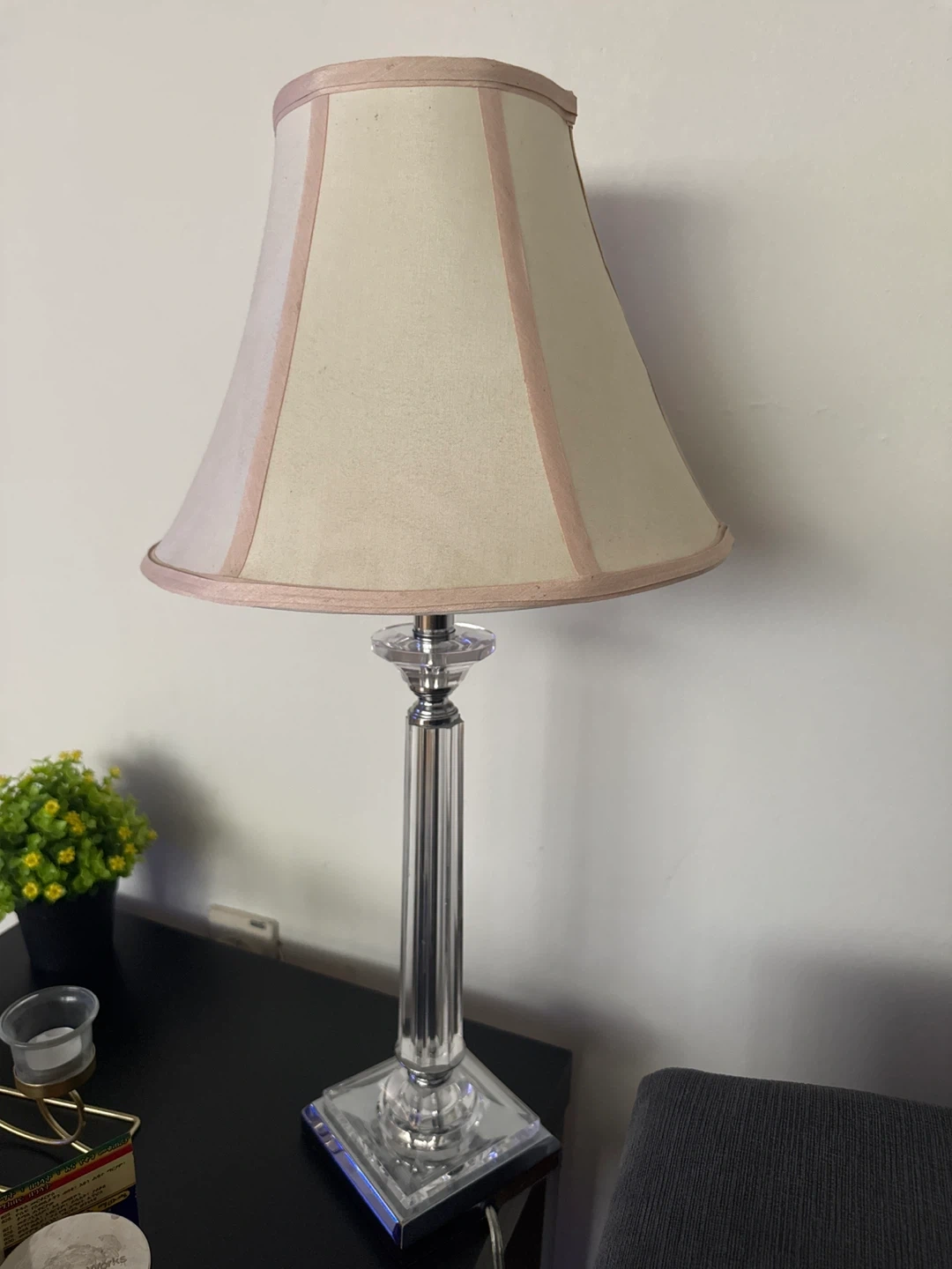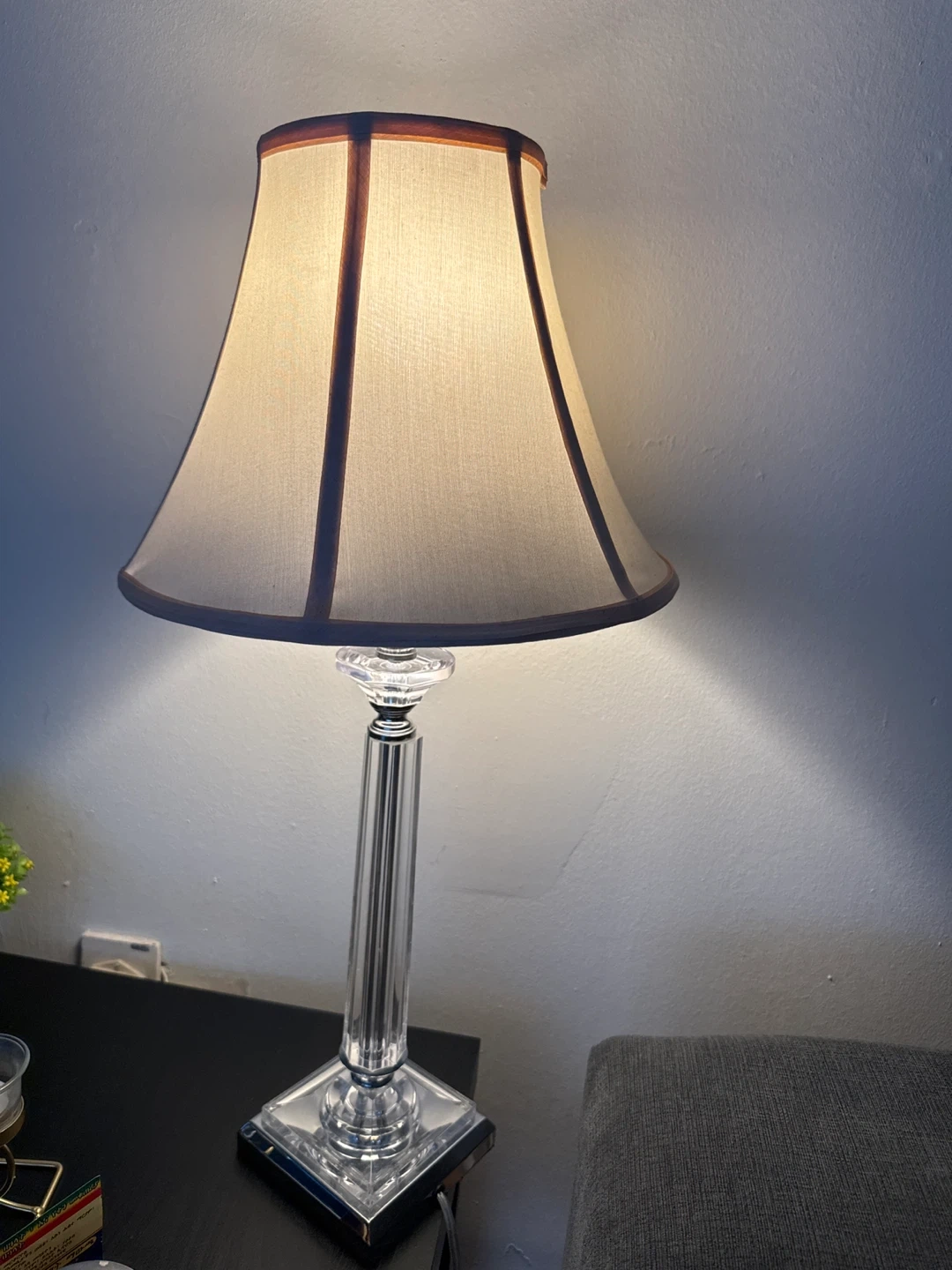 Elegant table lamp with a sparkling crystal and chrome base. It features a classic beige fabric lampshade with trim. Adds a touch of sophistication to any room!