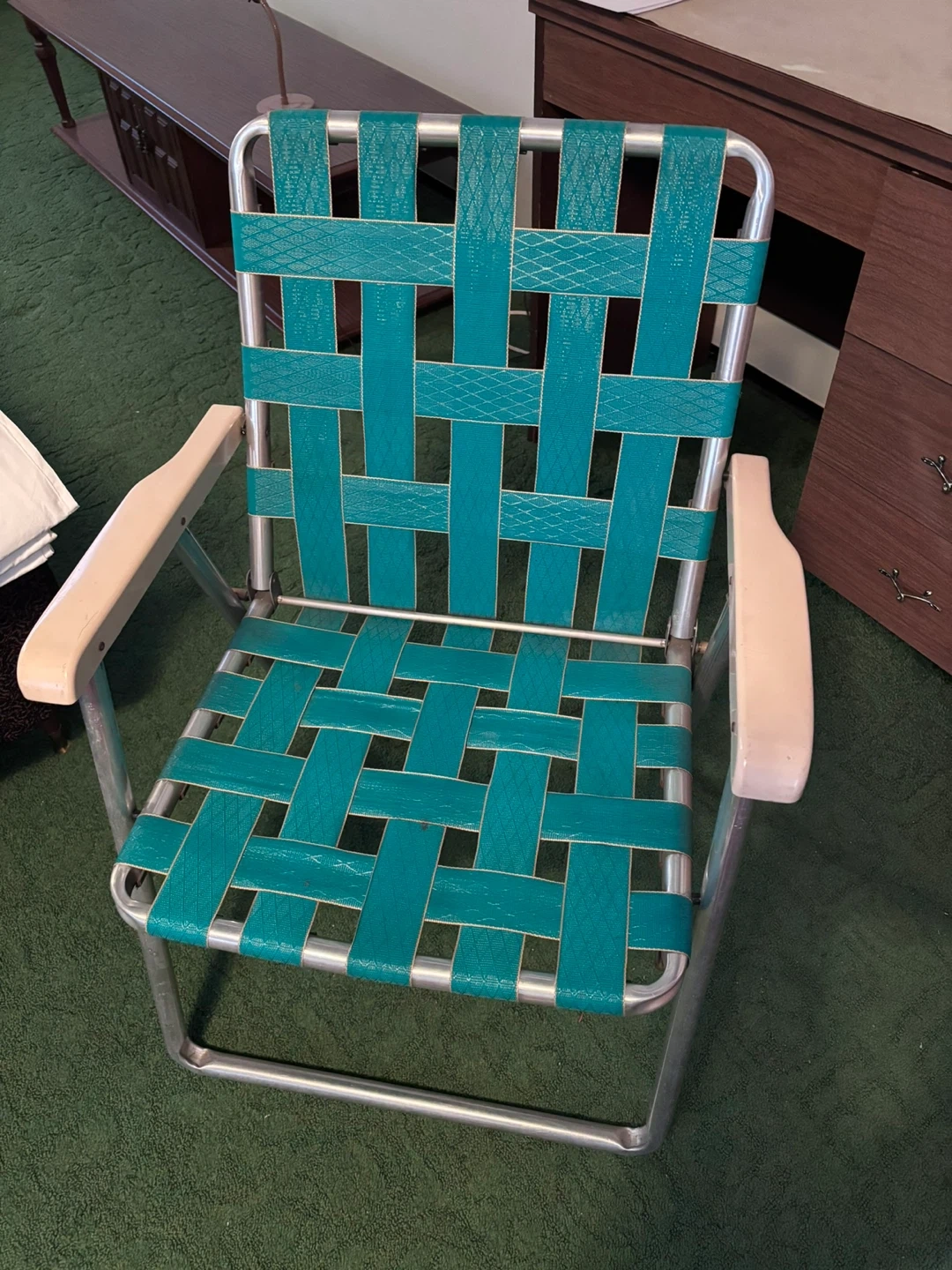 This is a webbed aluminum lawn chair. It's made with a durable aluminum frame and a woven teal fabric seat. The armrests are a light beige plastic.