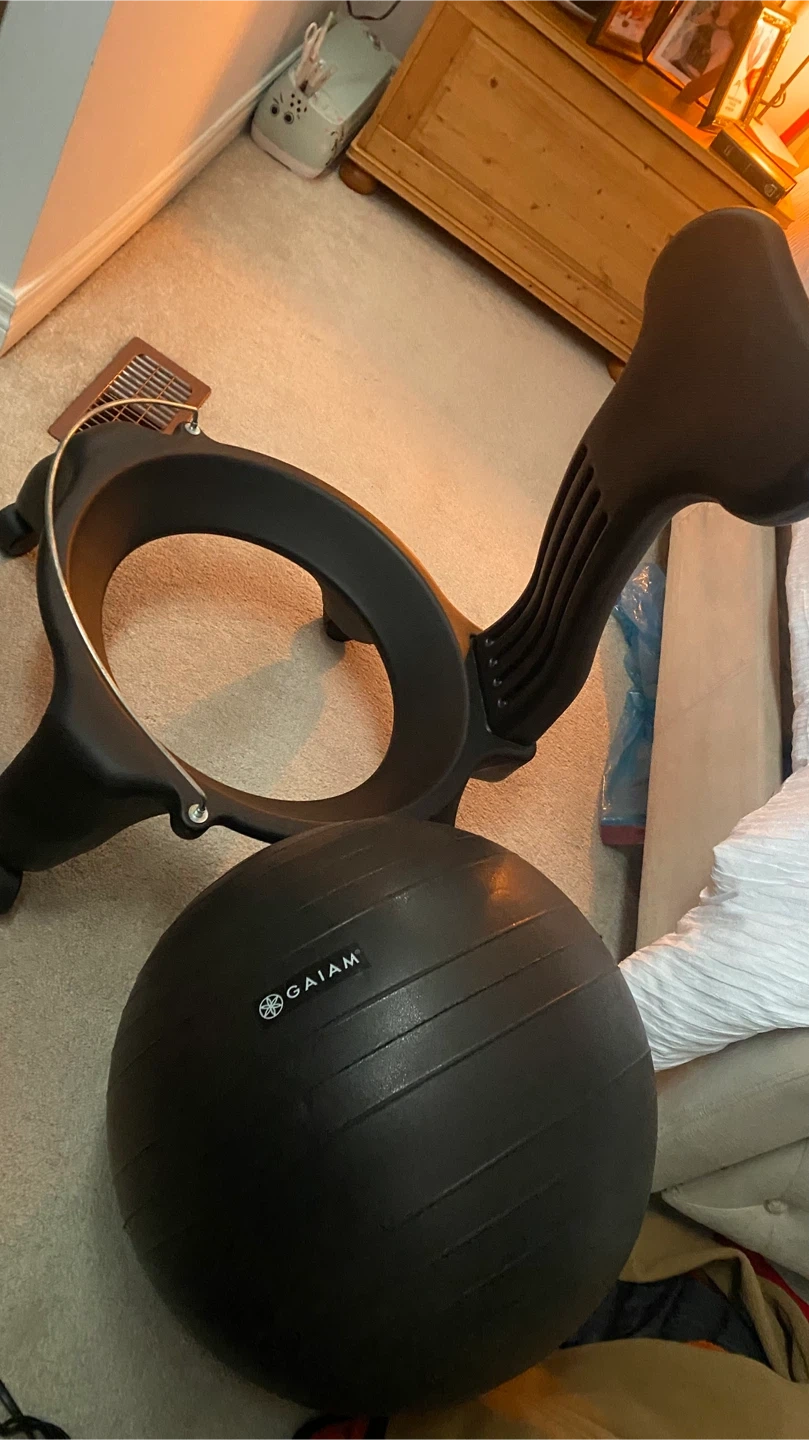 This Gaiam exercise ball chair is black. It's designed to promote active sitting and core engagement. The chair includes the stability ball and the base with wheels.