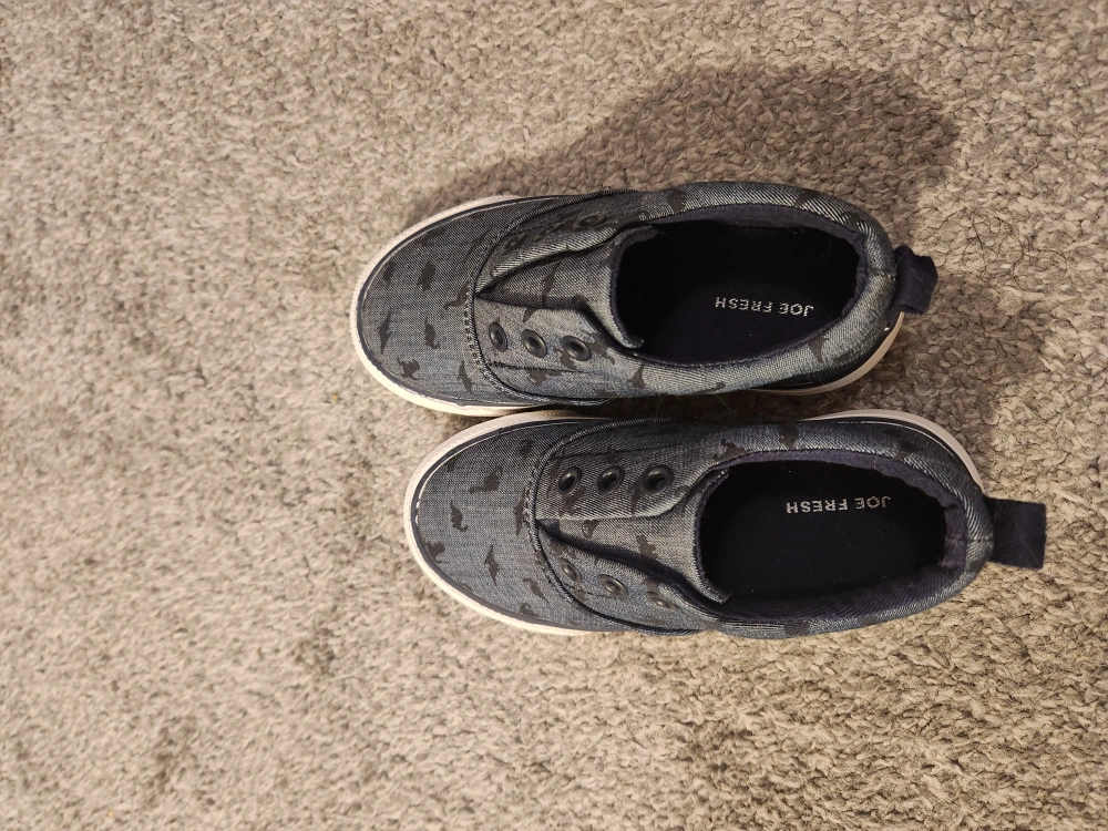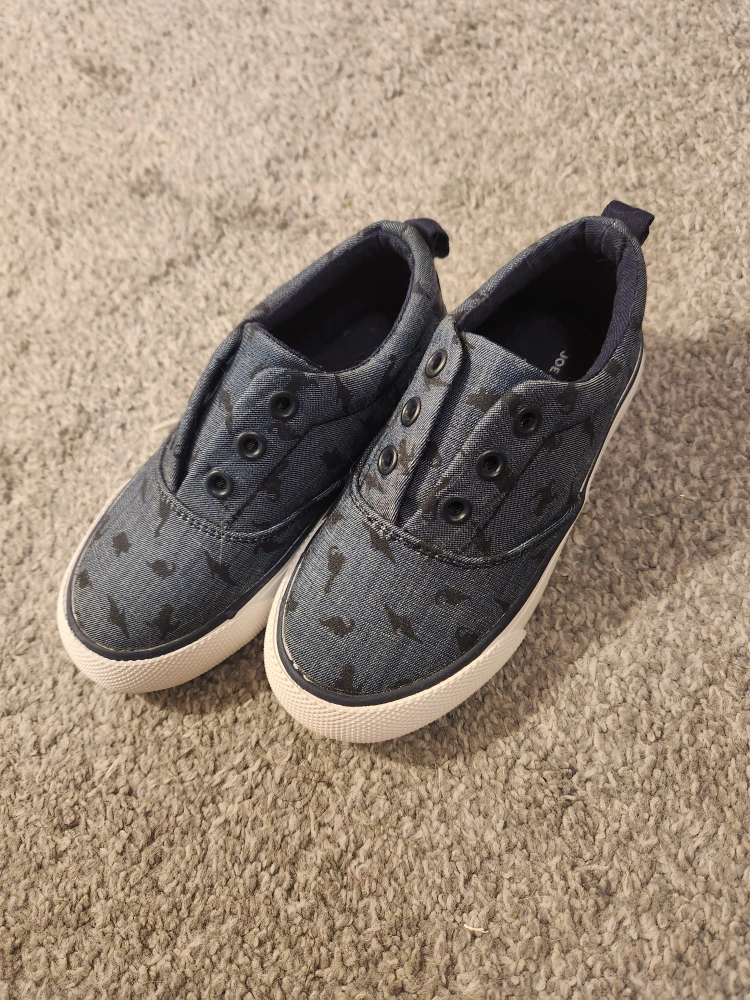 These are Joe Fresh toddler slip-on shoes, size 9, featuring a cool dinosaur print in a cute denim material. These shoes have never been worn and are brand new! Easy to slip on and off, these shoes are great for everyday wear. Perfect for your little one's adventures!