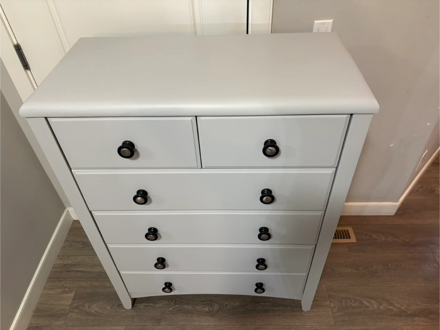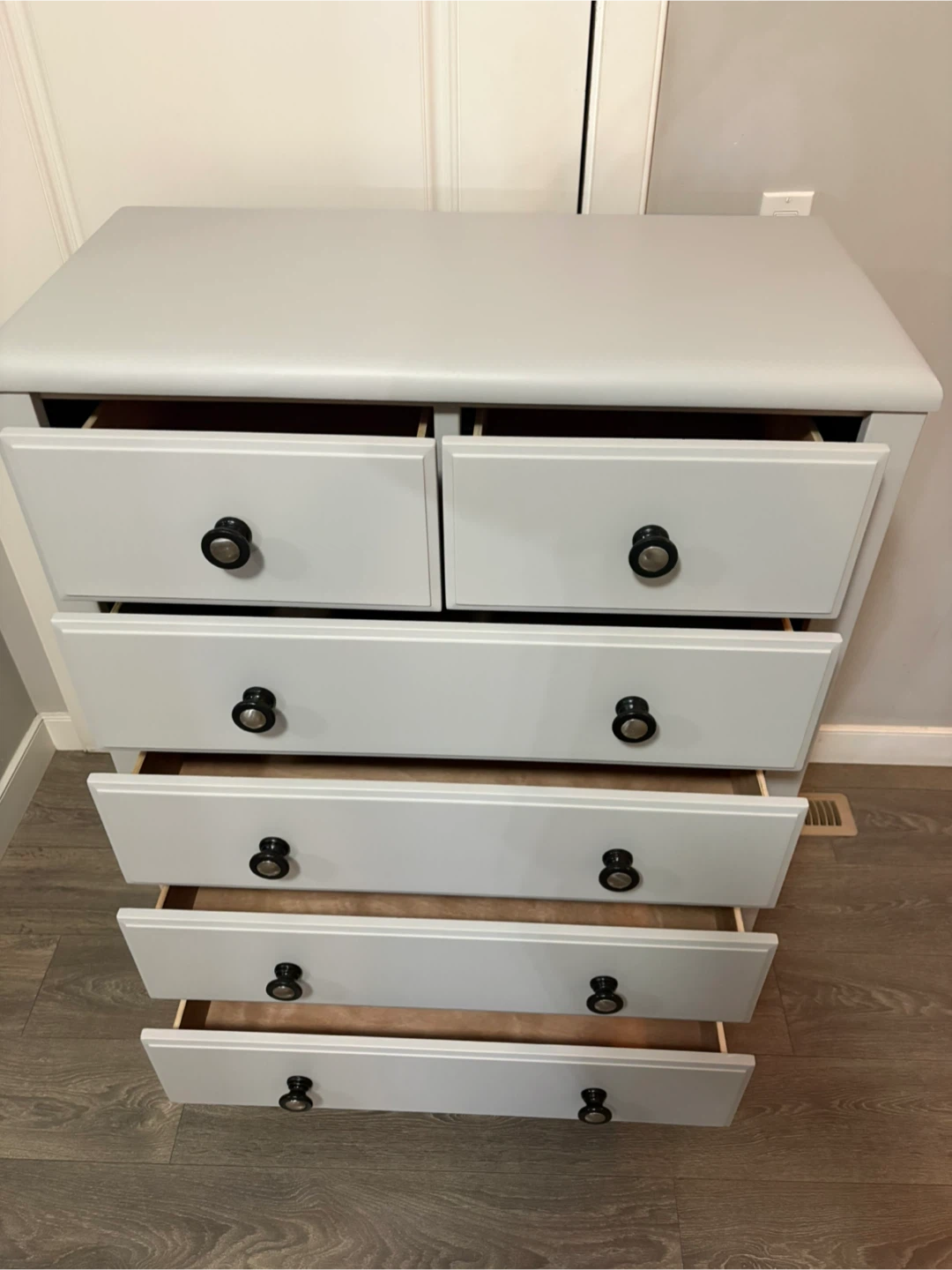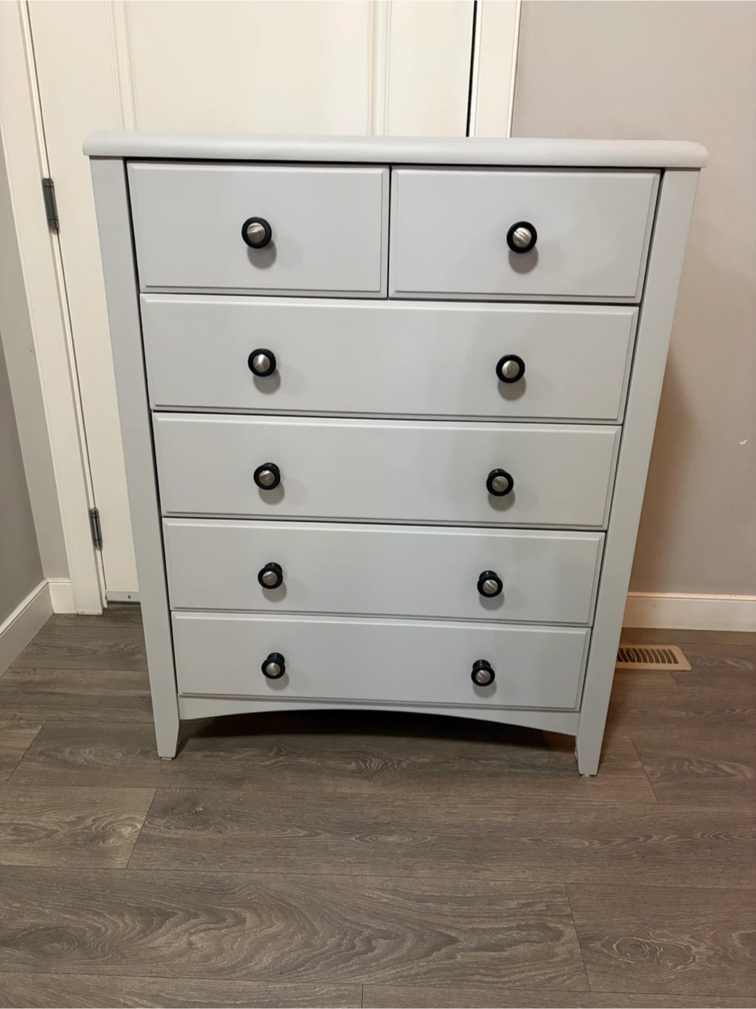 This is refinished grey dresser with six drawers in excellent condition. It’s perfect for adding storage space to any bedroom or living area. The neutral grey colour ensures it will fit seamlessly with any decor style. The drawers are very clean with locking rails.