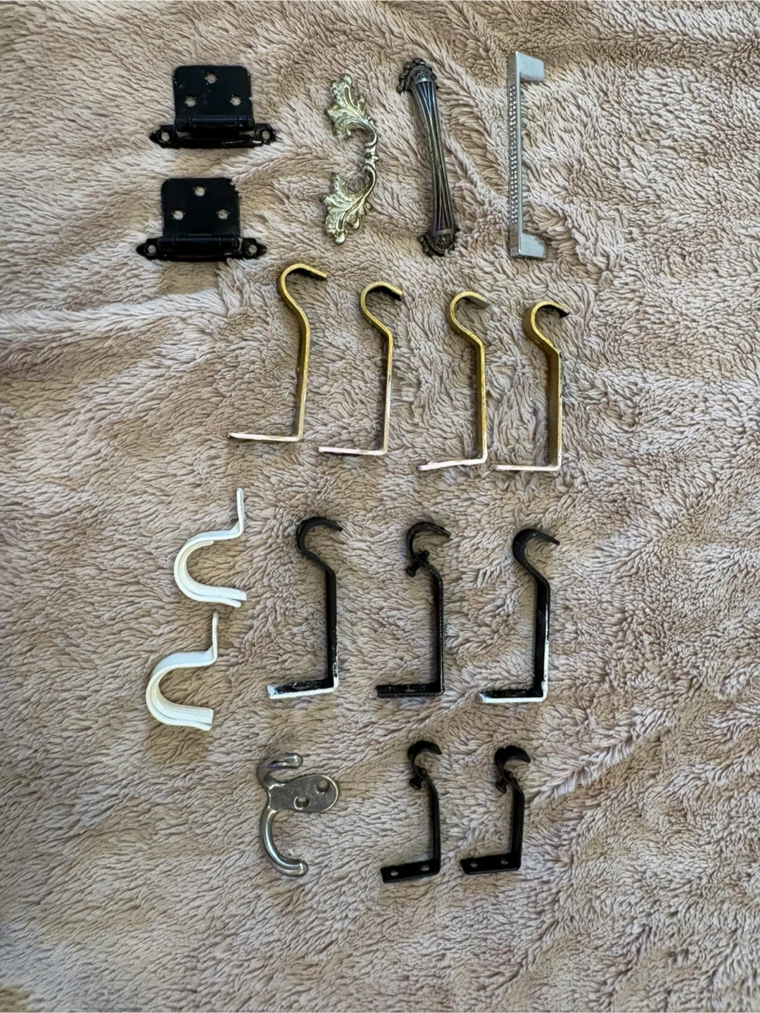Lot includes two black cabinet hinges, two decorative drawer pulls, and multiple assorted metal hooks. Various styles and finishes are present, including brass, silver, and black. These are great for DIY projects or replacing old hardware.