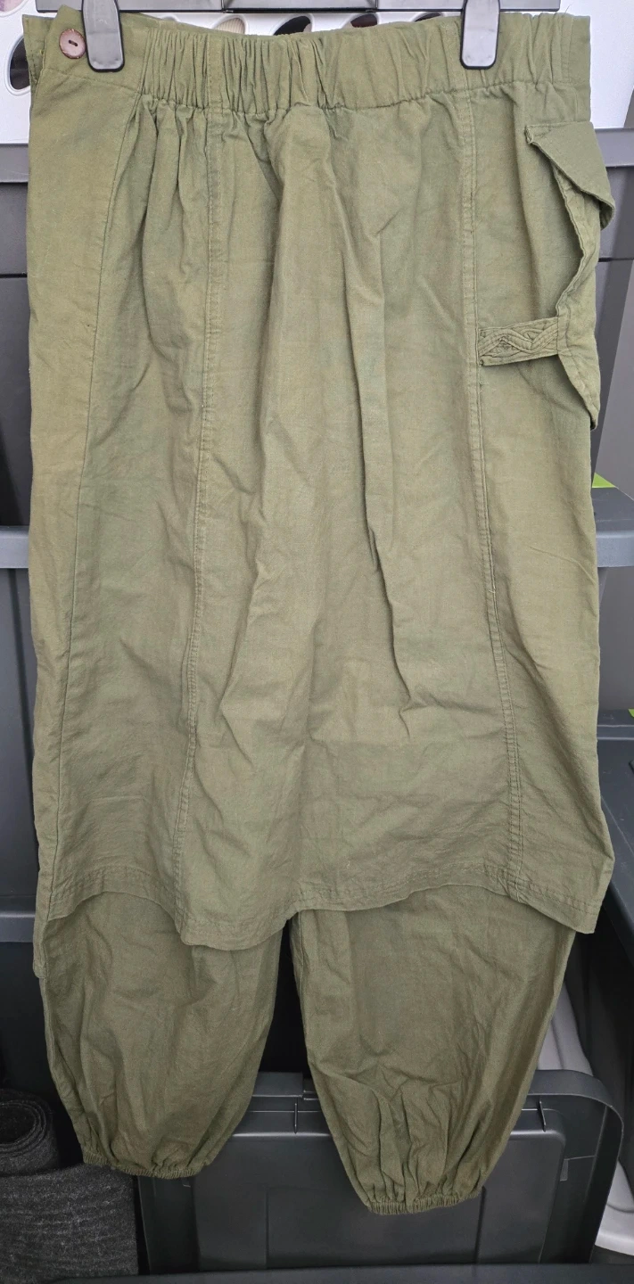These olive green hippie pants feature a unique wrap-around design with multiple pockets. They're made from 100% cotton material and have an elastic waistband for comfort. Has a side pocket outer pocket and wooden buttons. Great for casual wear or outdoor activities!