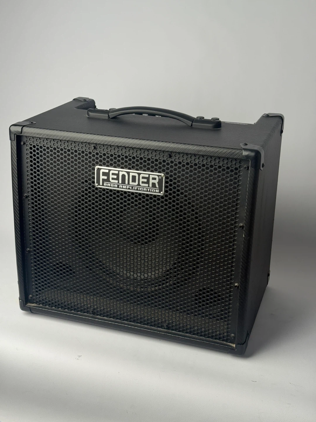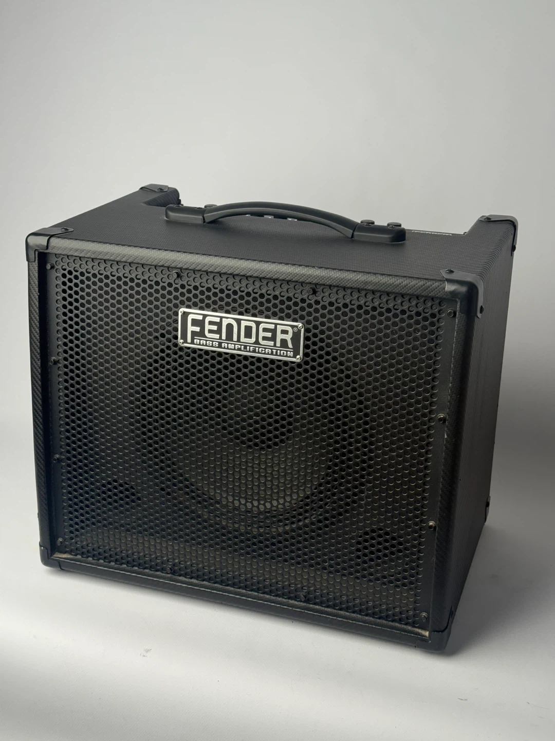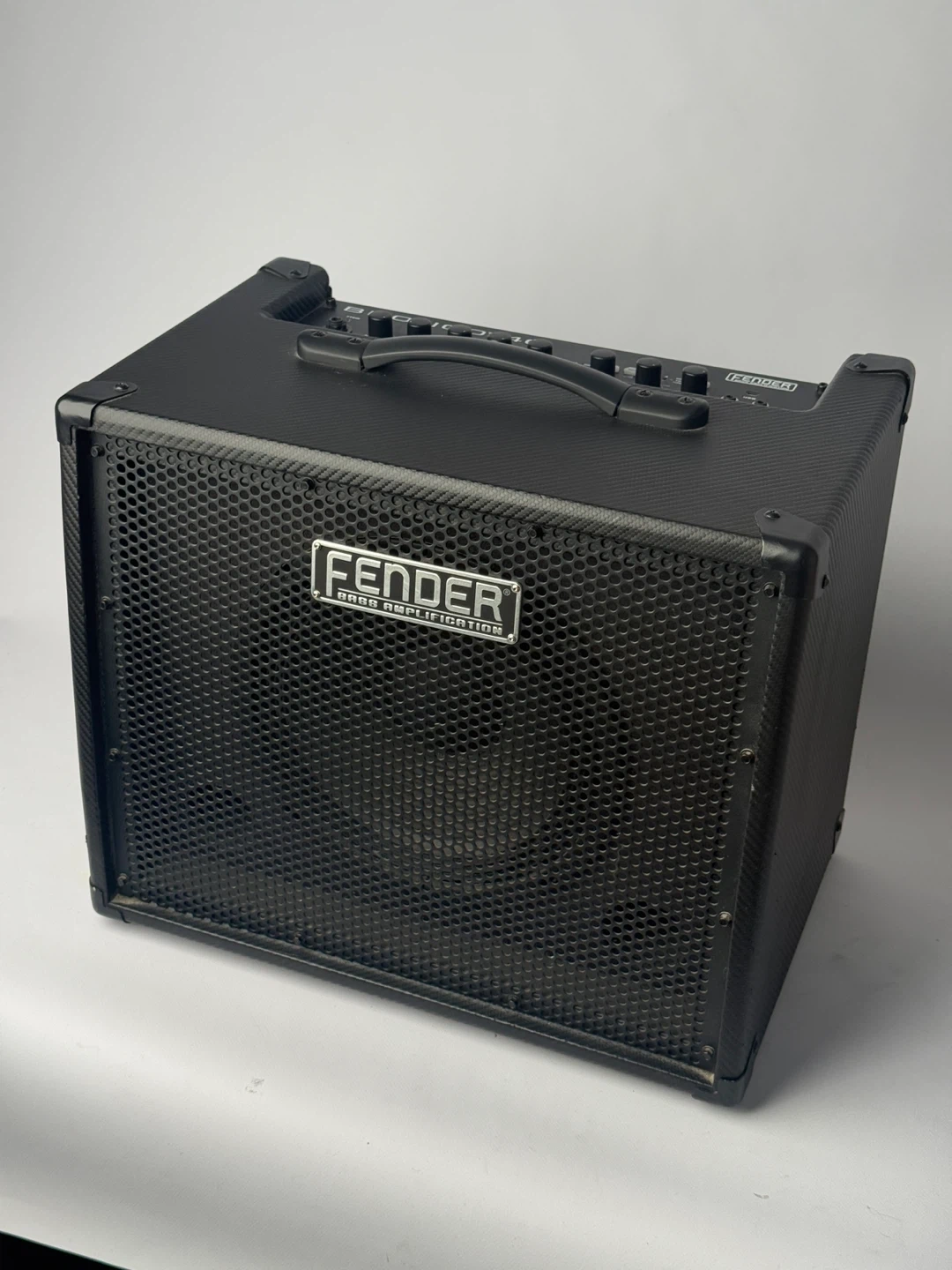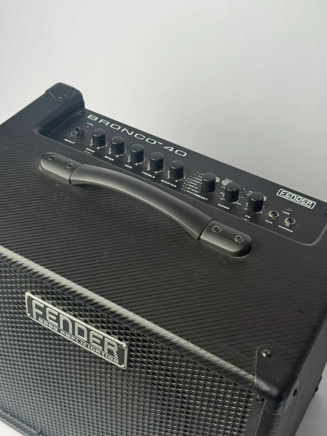 Fender Bronco 40 bass amplifier. It's a 40-watt combo amp with a 10-inch speaker. Includes controls for gain, bass, mid, treble, master, compression, and FX.