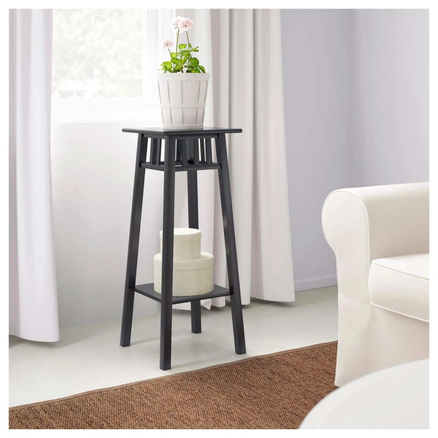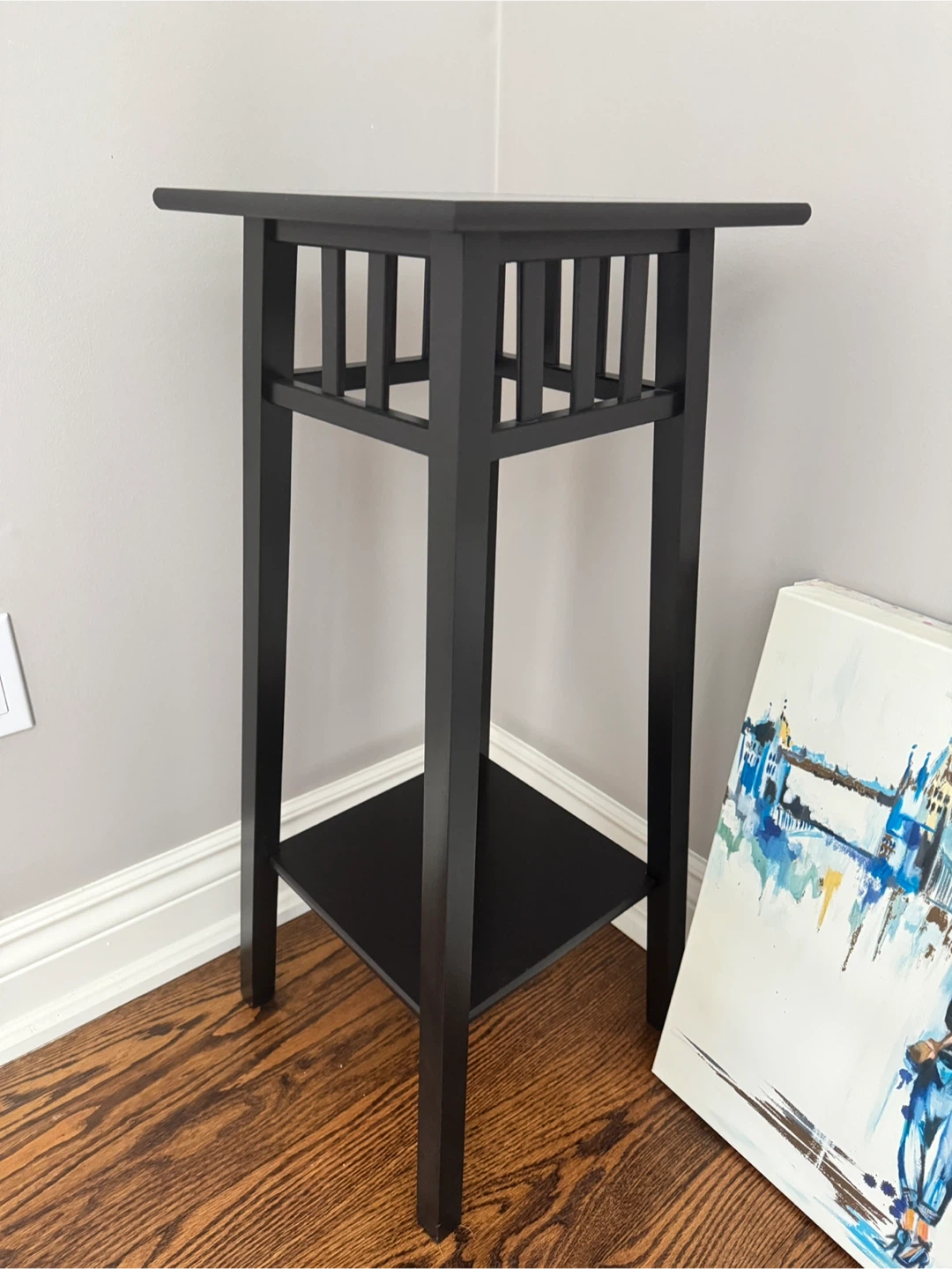 This is a tall, black accent table with two tiers for storage or display. Its simple, modern design makes it a versatile addition to any room. Perfect for holding a plant, books, or decorative items.