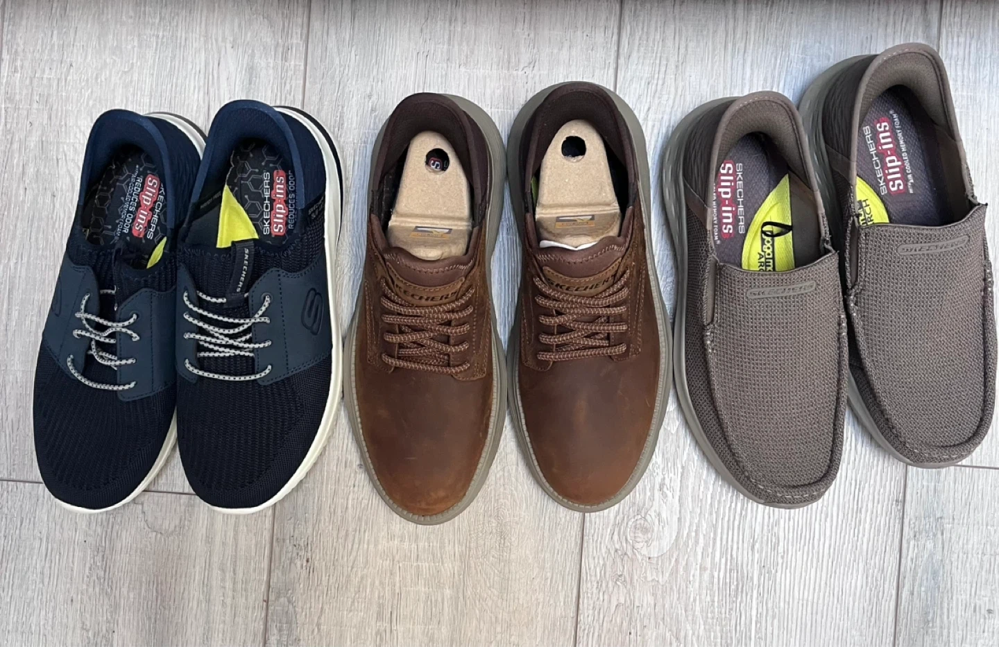 3 pair of men’s Skechers Slip-ins shoes with Air Cooled Memory Foam. Features Relaxed Fit and odor reduction.