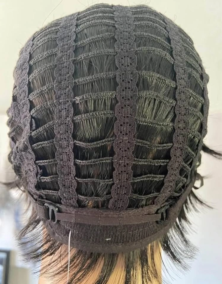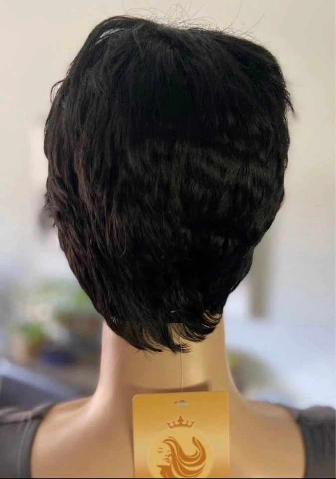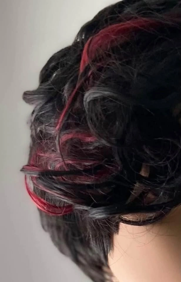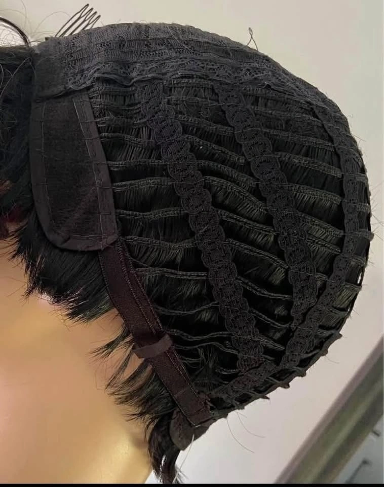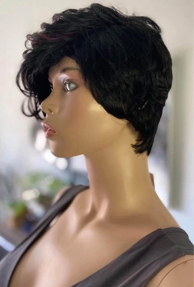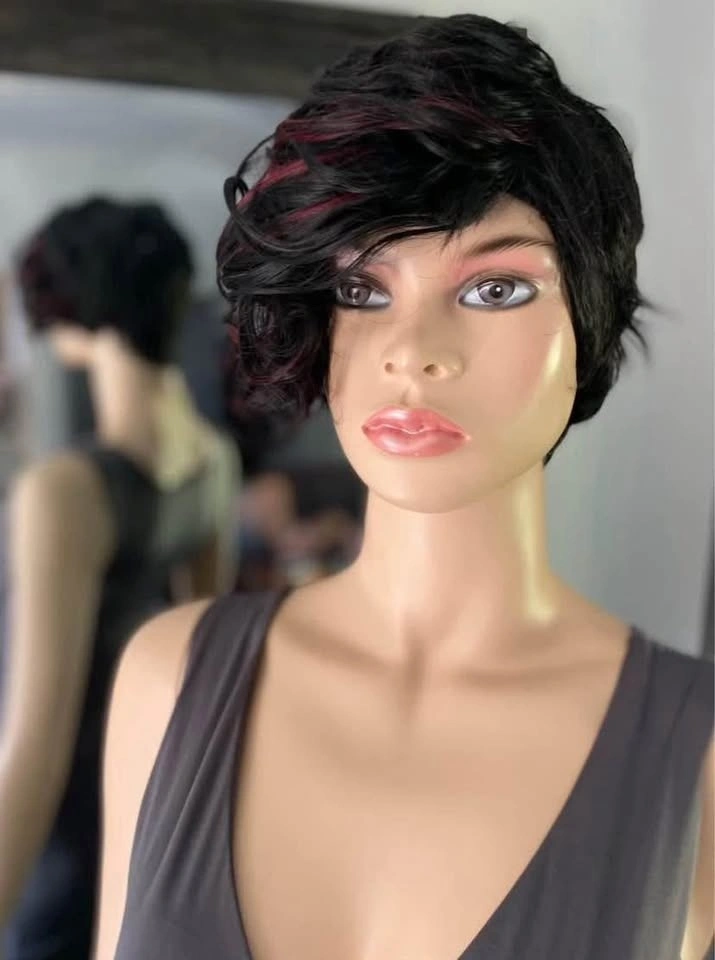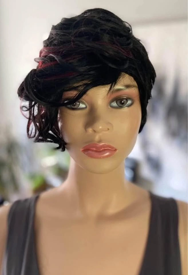 NWT: Pixie Style Short Asymmetrical Black Synthetic Wig with Red Wine Burgundy Highlights (678)