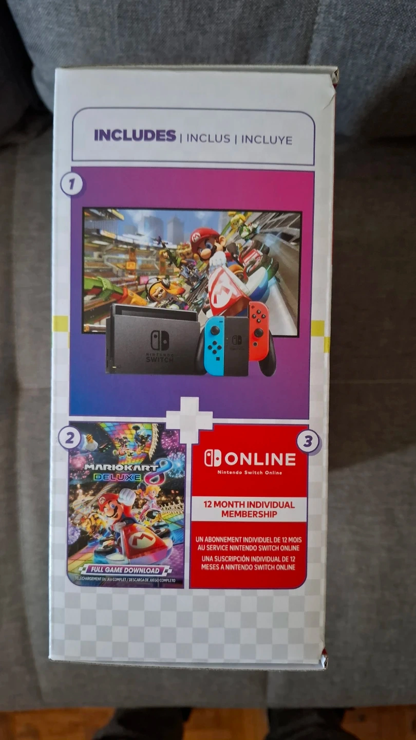 Nintendo Switch console with Joy-Con controllers. Includes a full game download of Mario Kart 8 Deluxe. Also comes with a 12-month Nintendo Switch Online individual membership. Get ready for some racing fun!