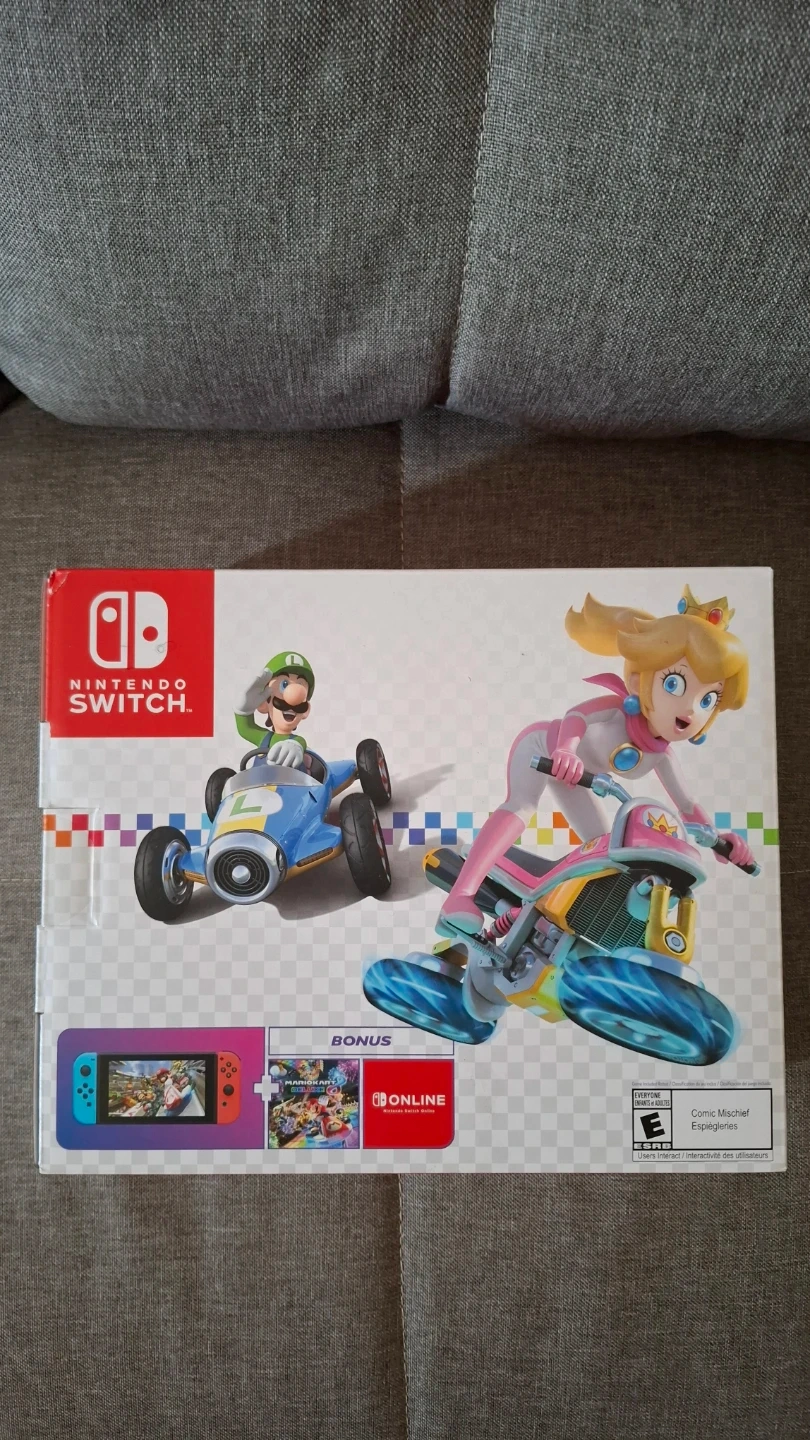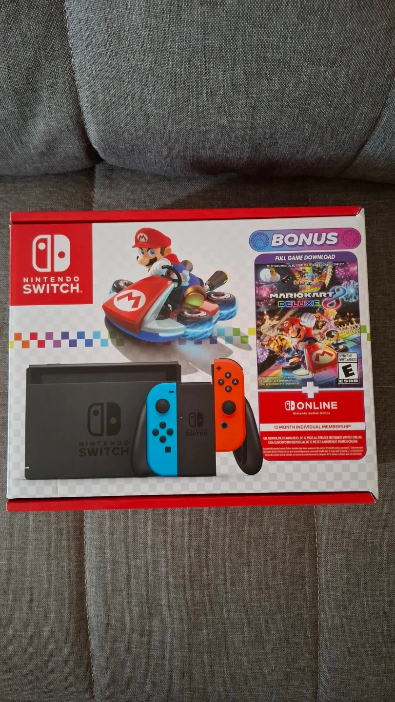 Nintendo Switch console with Joy-Con controllers. Includes a full game download of Mario Kart 8 Deluxe. Also comes with a 12-month Nintendo Switch Online individual membership. Get ready for some racing fun!