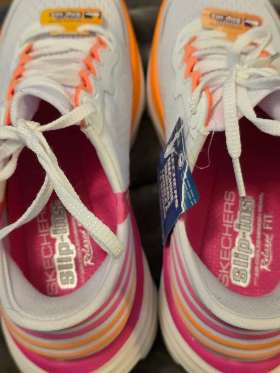 These are a pair of brand new Skechers Slip-ins Relaxed Fit shoes in a women's size 7! They are machine washable and feature hands-free technology for easy wear.