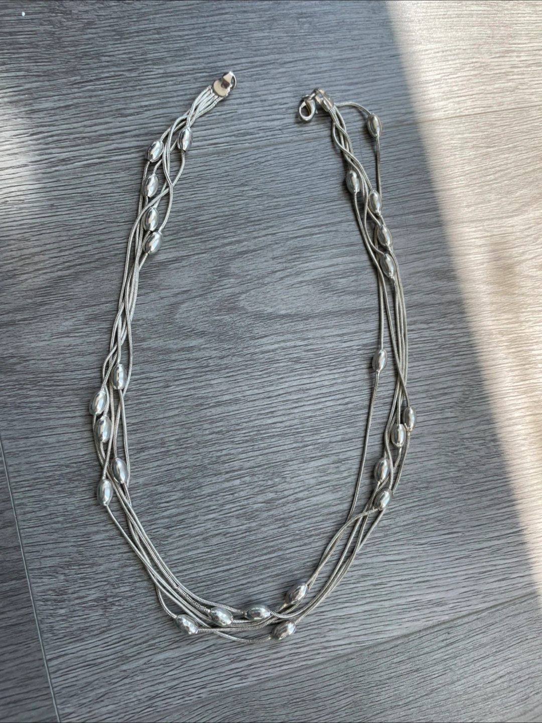 This is a beautiful silver lined multi-strand necklace with small beads. It's in great condition and ready to add a touch of elegance to any outfit.