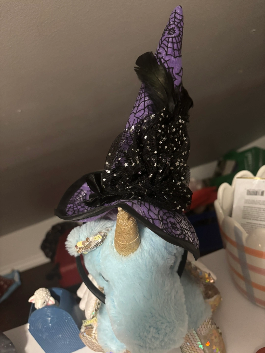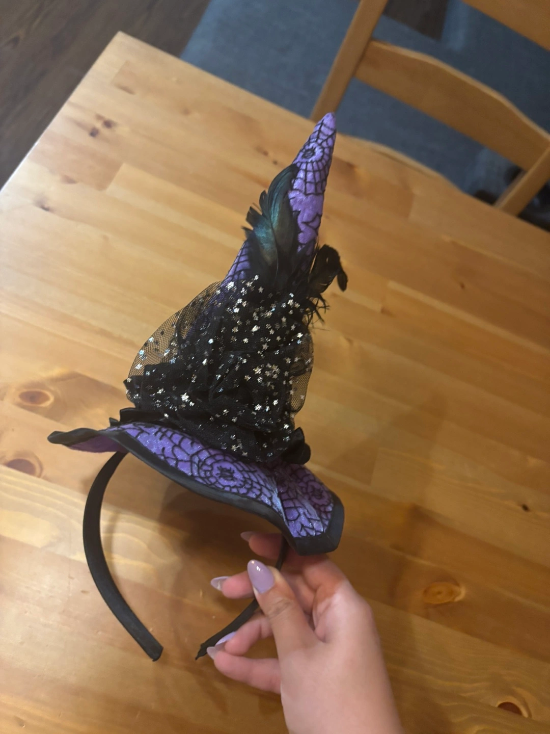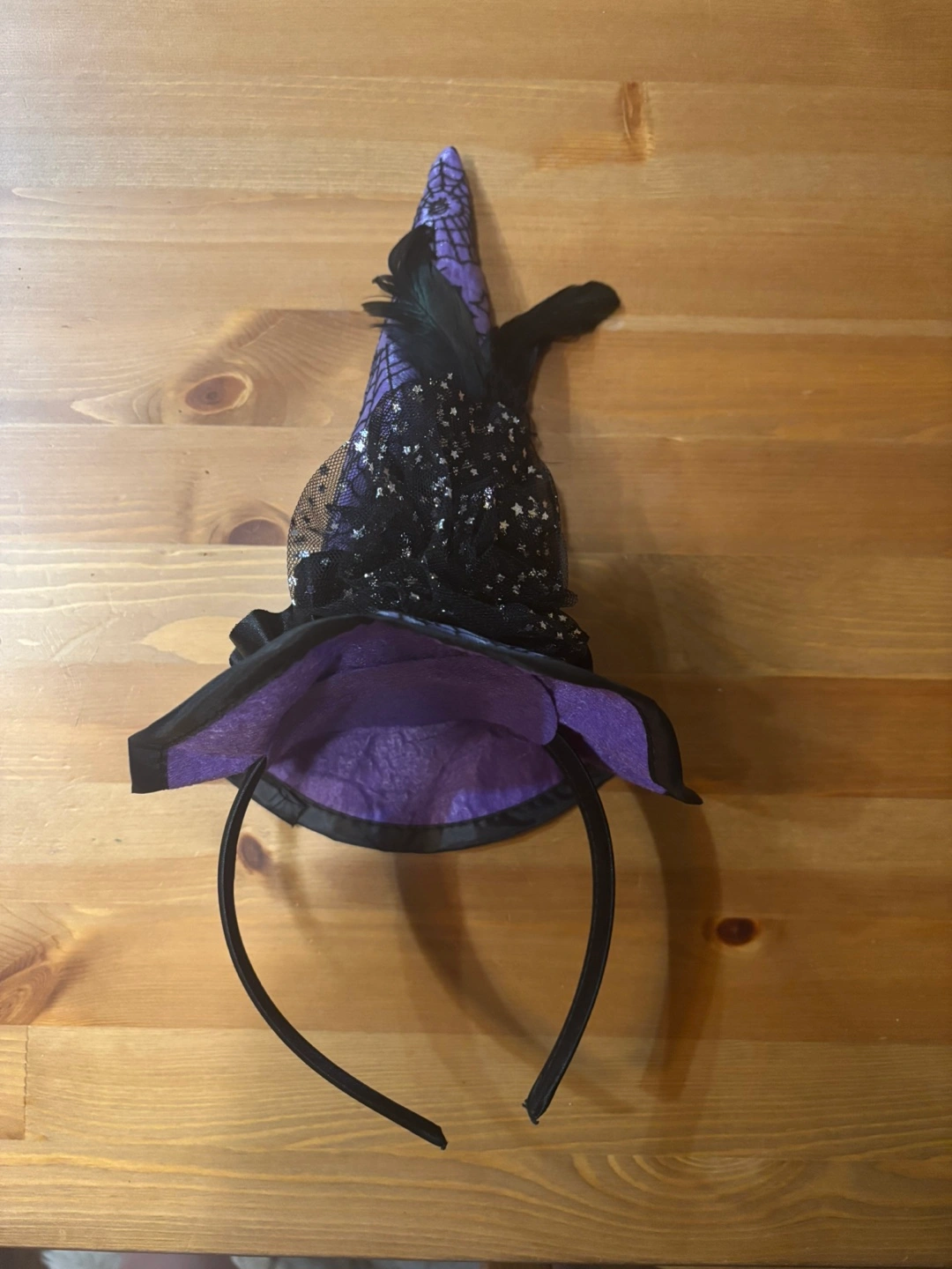 Cute witch hat headband, perfect for Halloween or dress-up! Features a purple and black design with netting and feather accents.