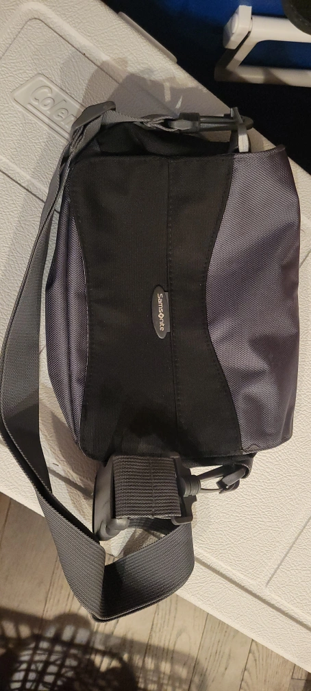 This is a gently used Samsonite shoulder bag in black and grey. It features a convenient adjustable strap and multiple compartments for organization. Perfect for everyday use or travel!