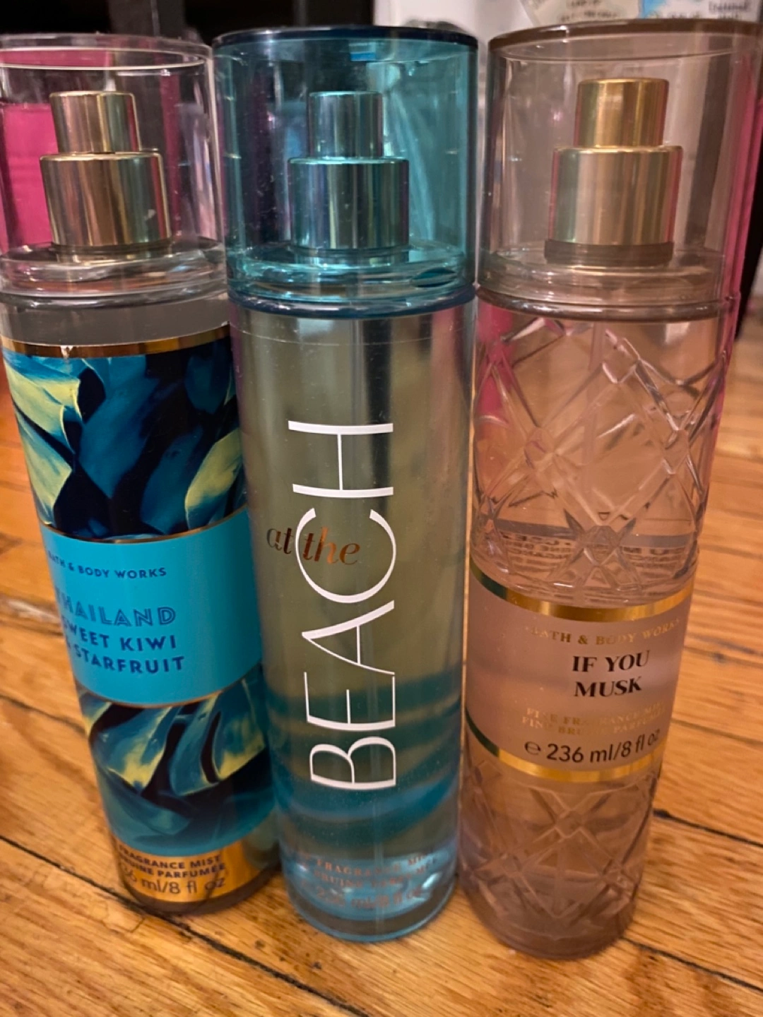 Selling three Bath & Body Works fragrance mists: Thailand Sweet Kiwi Starfruit, At the Beach, and If You Musk! Each bottle contains 236 ml / 8 fl oz
