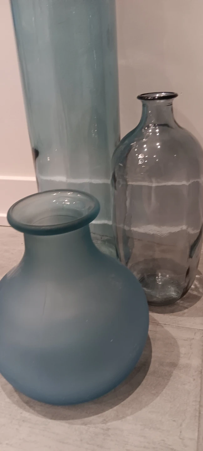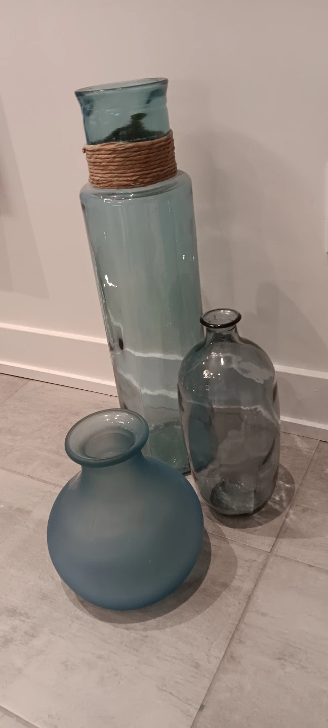 This set includes three blue glass vases of varying sizes and shapes. One tall, slender vase is wrapped with twine near the top. Another is a round, frosted blue vase, and the third is a clear, bulbous vase. They're perfect for adding a decorative touch to any room!