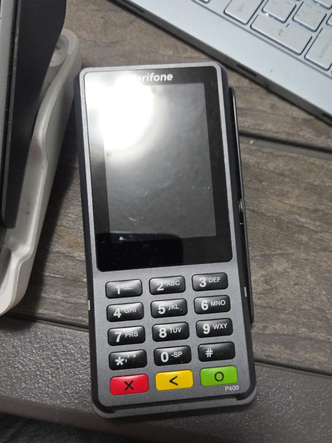 Verifone P400 payment terminal. This device is designed for secure and efficient credit card processing. It features a full keypad and a clear display for transactions.
