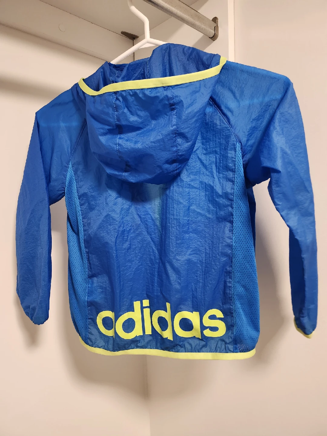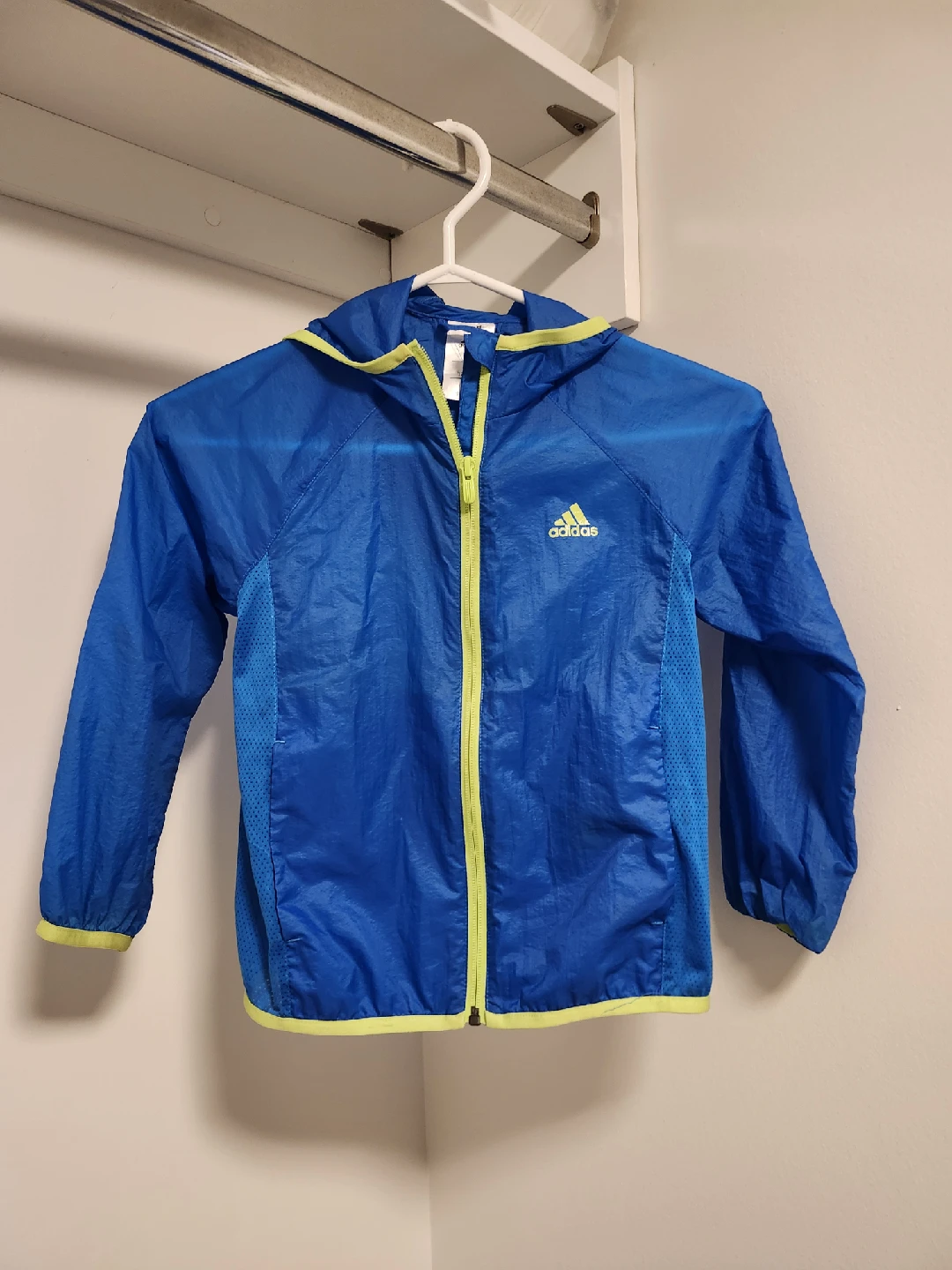 This Adidas kids' windbreaker is perfect for those breezy days! It's a bright blue colour with yellow accents. The size is 120, which is recommended for kids aged 5-6 years with a height of 44-45.5 inches, chest of 24 inches, waist of 22 inches, and hip of 25 inches. Great for keeping your little one protected from the wind!