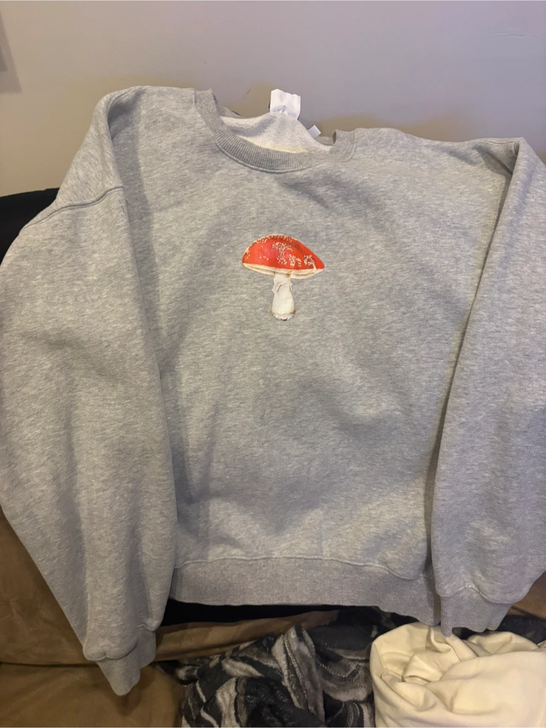 Comfy grey crewneck sweatshirt featuring a unique fly agaric mushroom graphic. It's made from a soft, mid-weight material. This sweatshirt is great for casual wear!
