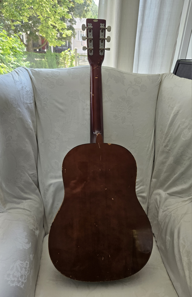 It is in fair-good condition , perfect for someone looking for a campfire guitar or a quick guitar to pick up and practice on.
