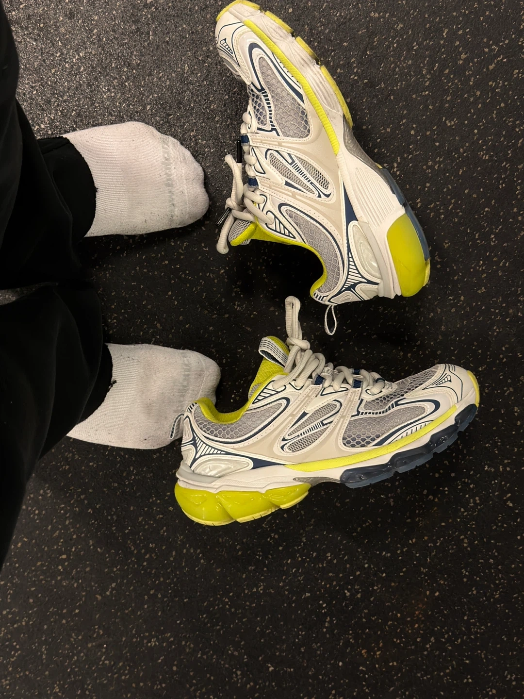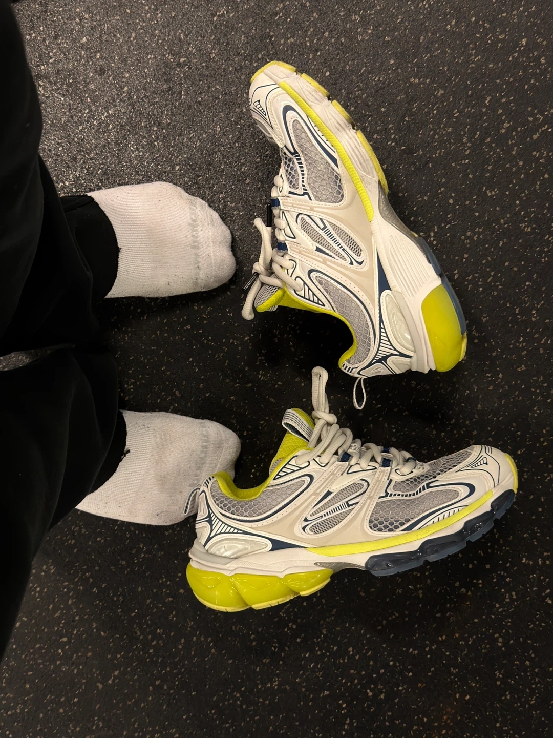 Balenciaga Runner sneakers in white, grey, and neon yellow. These athletic shoes feature a layered design with mesh and synthetic overlays. Lace-up closure.