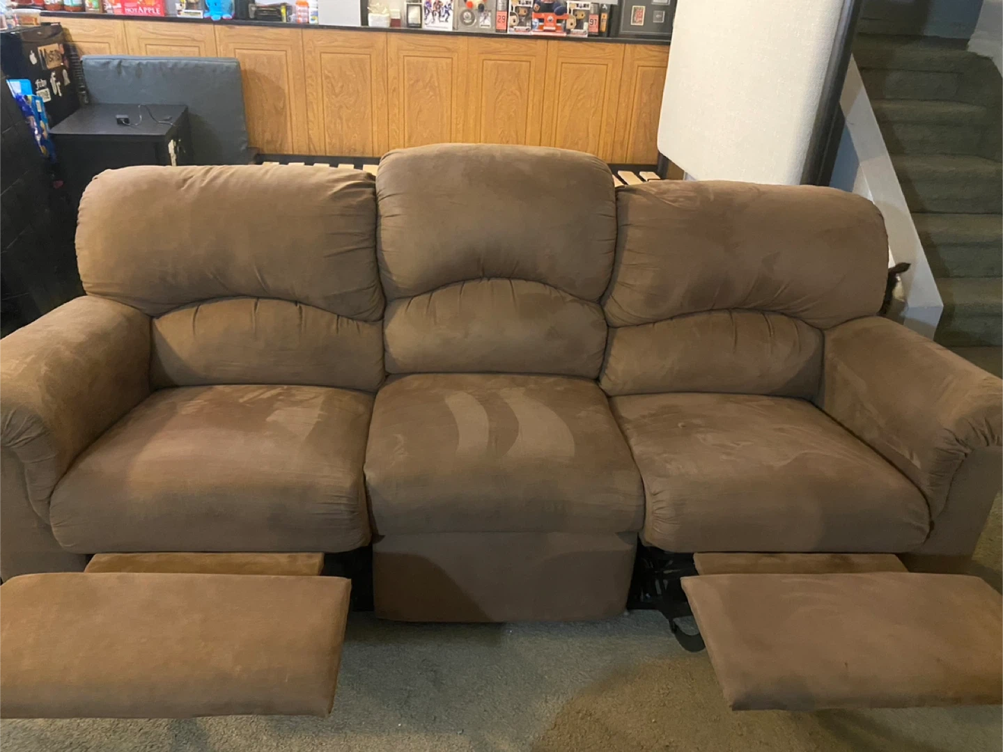 Three-seater reclining sofa and a reclining chair in a soft brown fabric. It has three seats with reclining sofa footrests and padded headrests. This sofa and chair offers comfortable seating for the whole family. I would like to get rid of them as soon as possible.