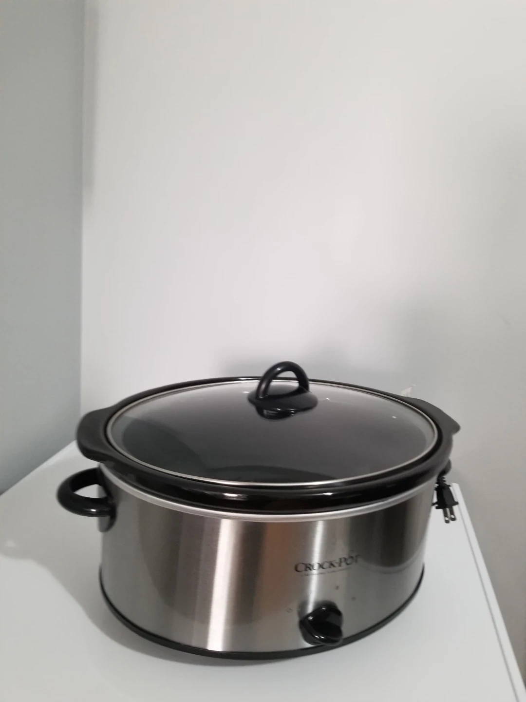 This is a Crock-Pot slow cooker. It's a stainless steel model with a glass lid. It has a manual dial for heat settings.