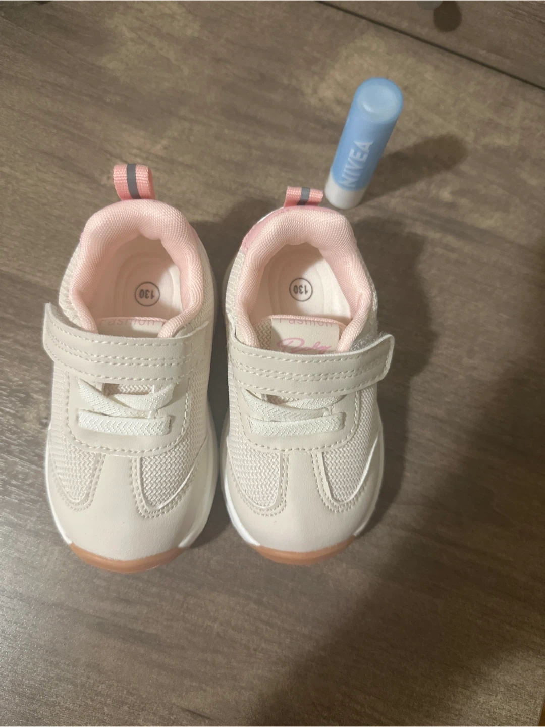 are designed with a breathable mesh and a rubber sole for comfort. The colour is a soft pink. Fastening is by hook and loop straps and laces.