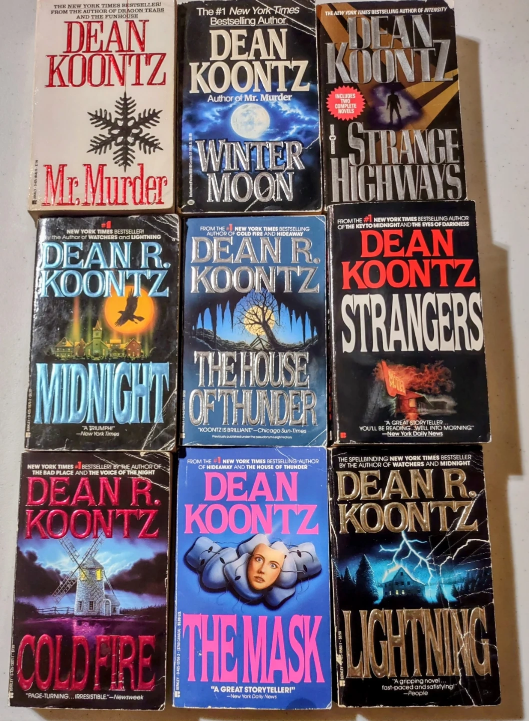 This is a collection of 31 paperback novels by Dean Koontz. Titles include 'Mr. Murder', 'Winter Moon', 'Strange Highways', 'Midnight', 'The House of Thunder', 'Strangers', 'Cold Fire', 'The Mask', 'Lightning', 'Survivor', 'The Voice of the Night', 'Hideaway', 'Icebound', 'From the Corner of His Eye', 'Dark Rivers of the Heart', 'The Door to December', 'False Memory', 'The Eyes of Darkness', 'Intensity', 'One Door Away, From Heaven', 'The Face', 'The Bad Place', 'Whispers', 'Watchers', 'The Servants of Twilight', and 'Dragon Tears'. All books are in good condition.
