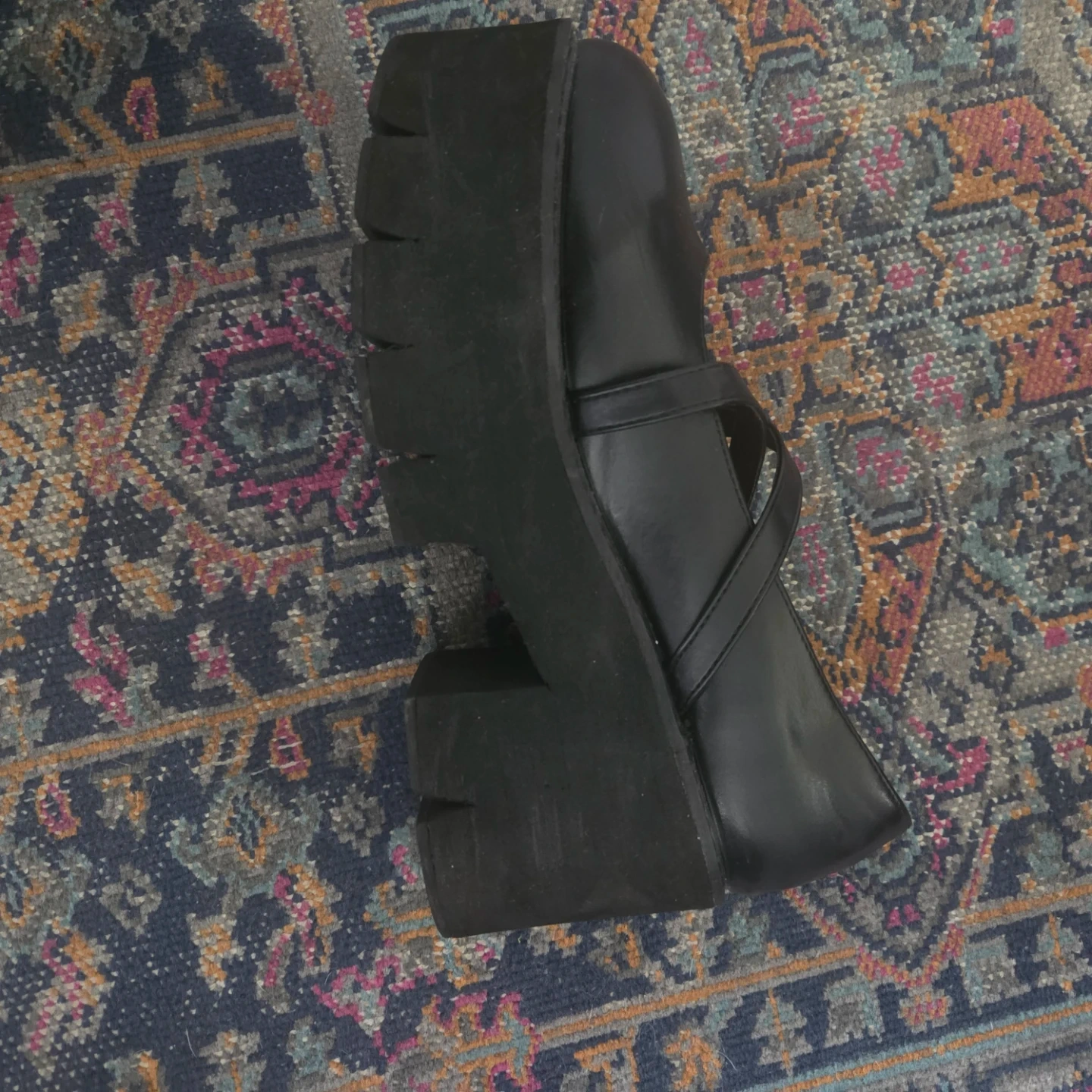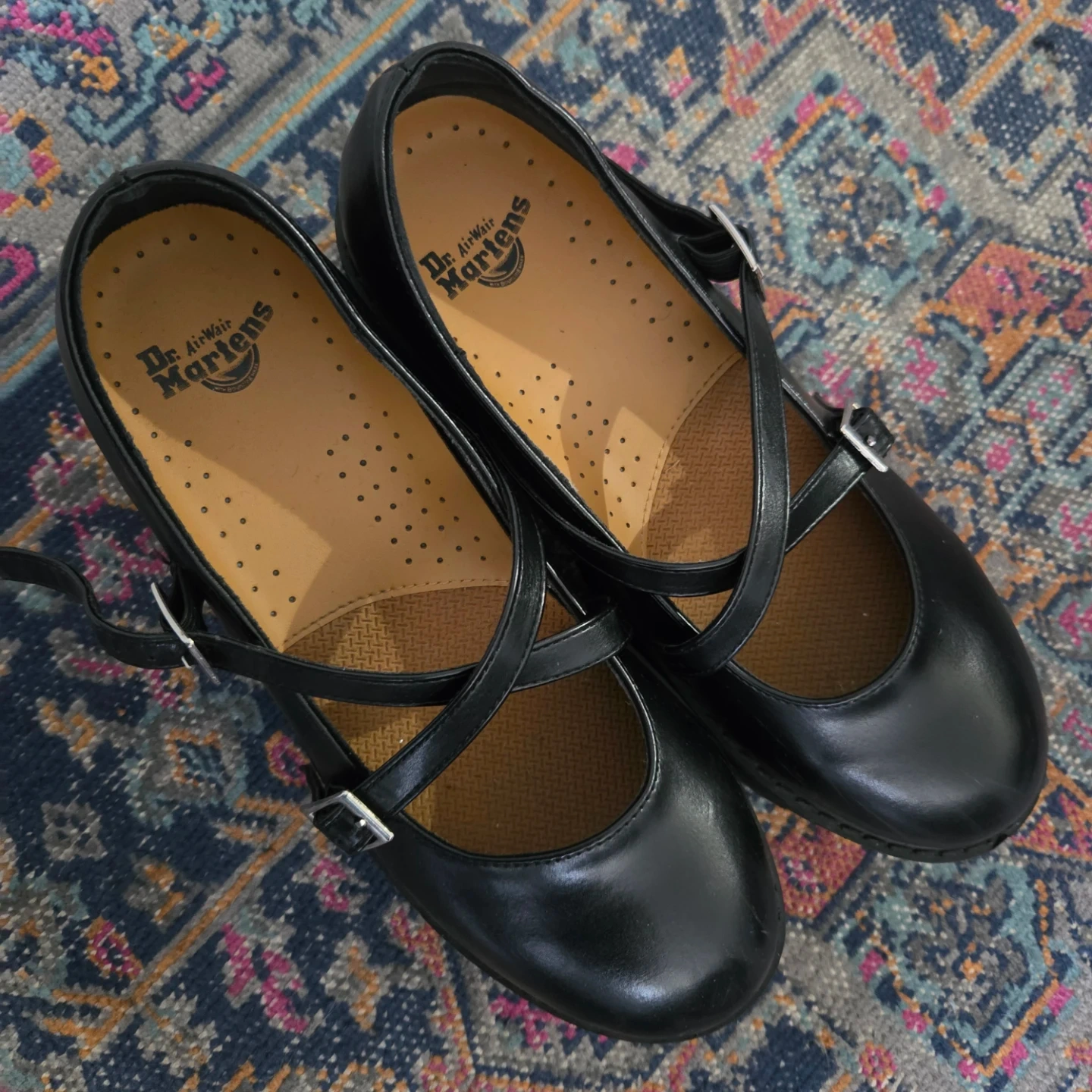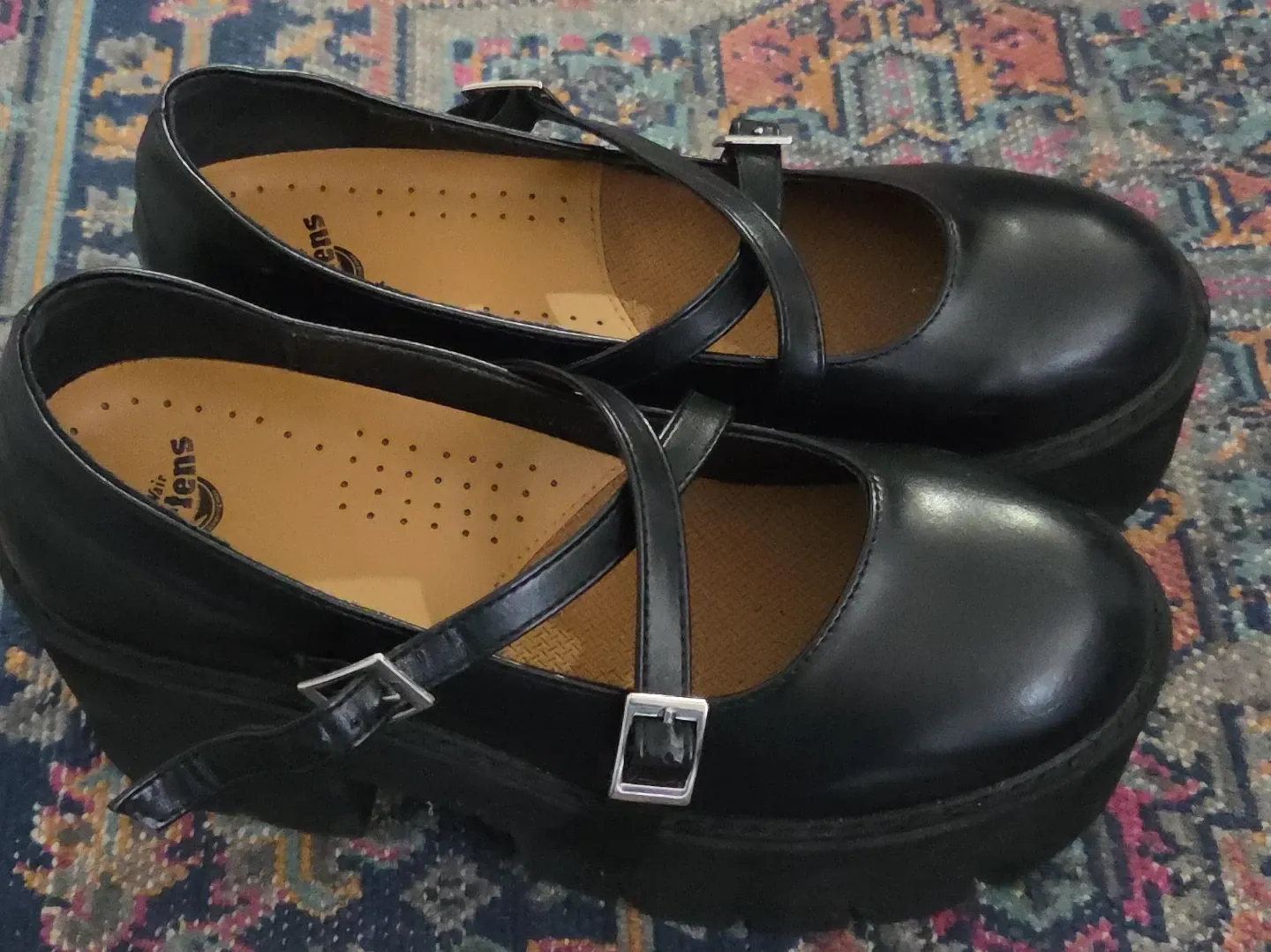 Dr. Martens Mary Jane shoes in black. Features crossover straps with buckle closures and a chunky platform sole. These shoes are made of leather. Very minor scuffs but in great condition, barely worn