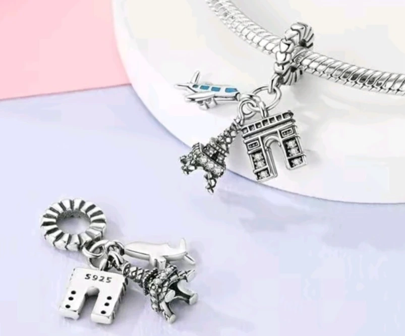 Pandora-style charm set featuring iconic Parisian landmarks. Includes Eiffel Tower, Arc de Triomphe, and a small airplane. These charms add a touch of wanderlust to any bracelet! Silver-tone metal. S925