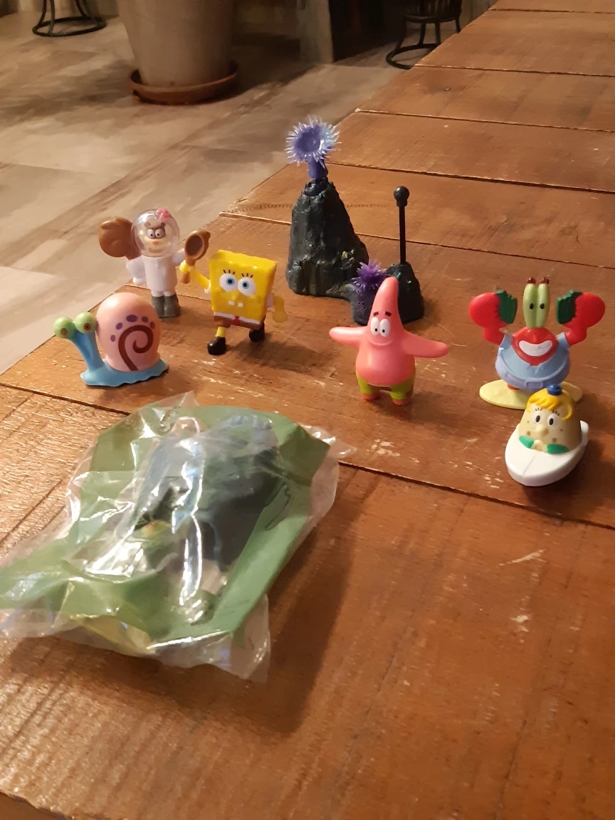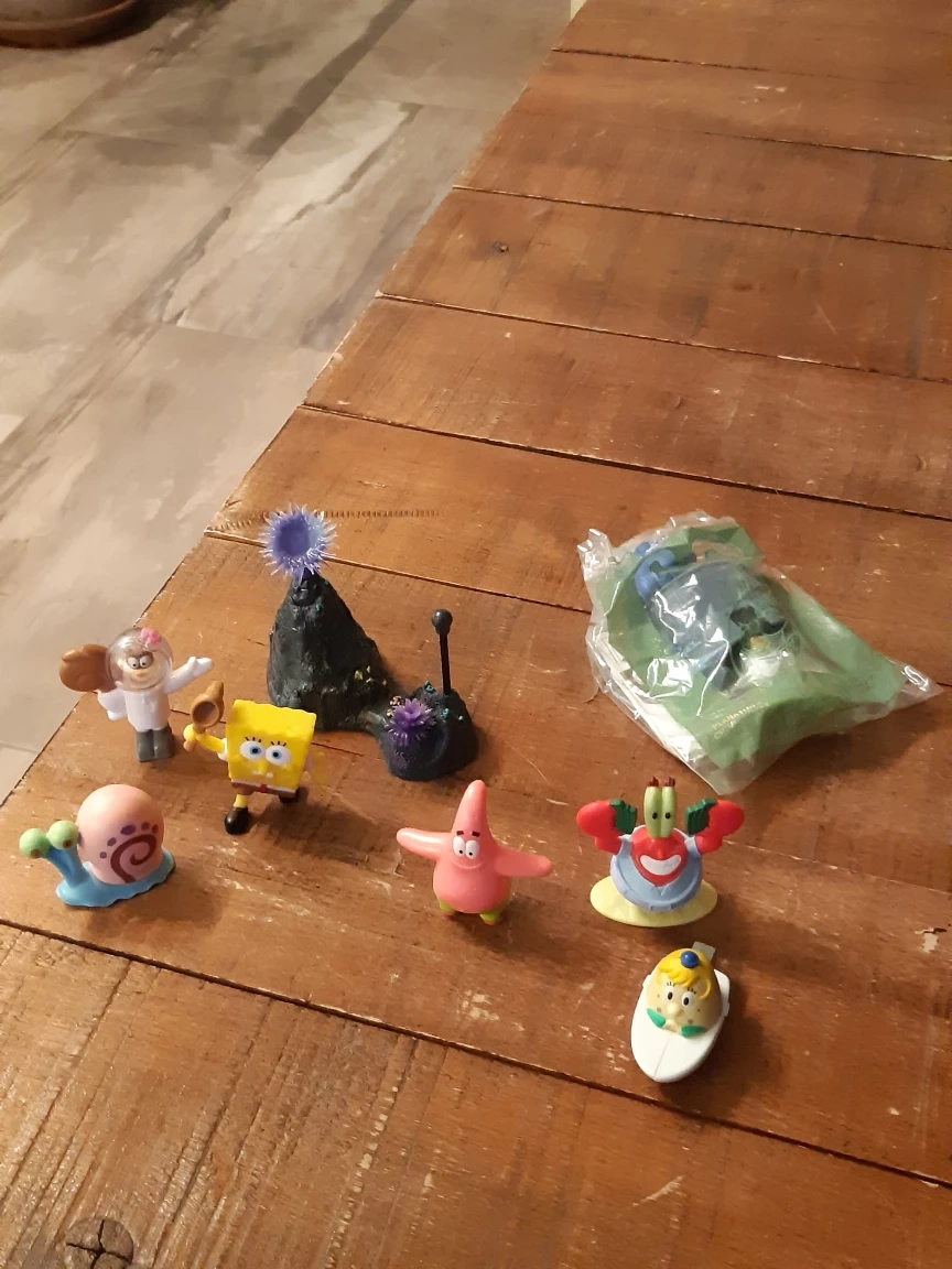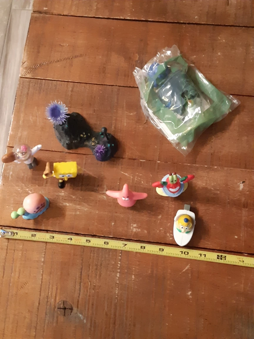 Spongebob, sandy, Gary, mr. Crabs, ms. Puff, Patrick, and unopened Plankton. + matching light up background piece. 8 different figures/pieces.