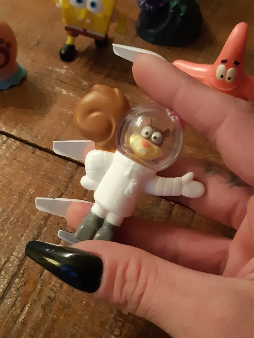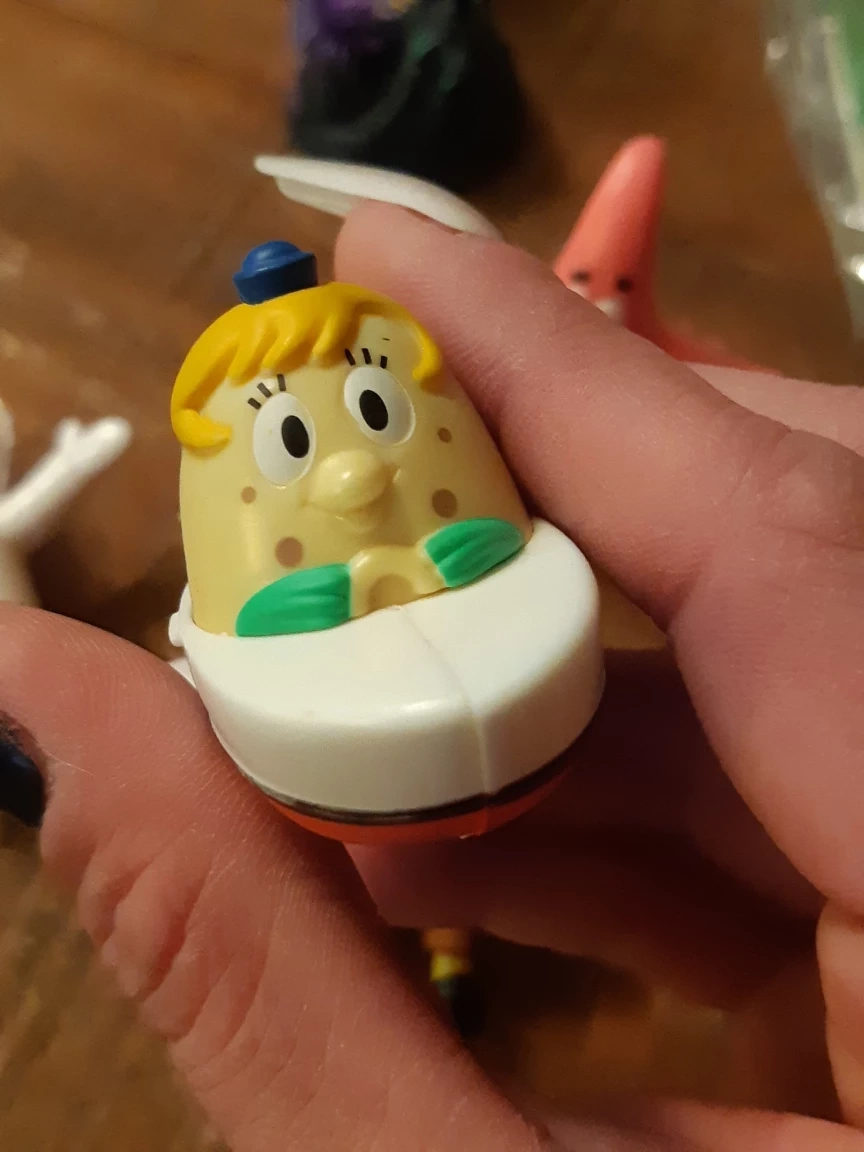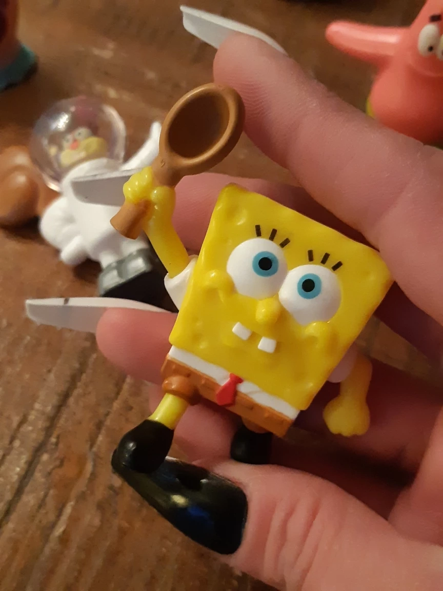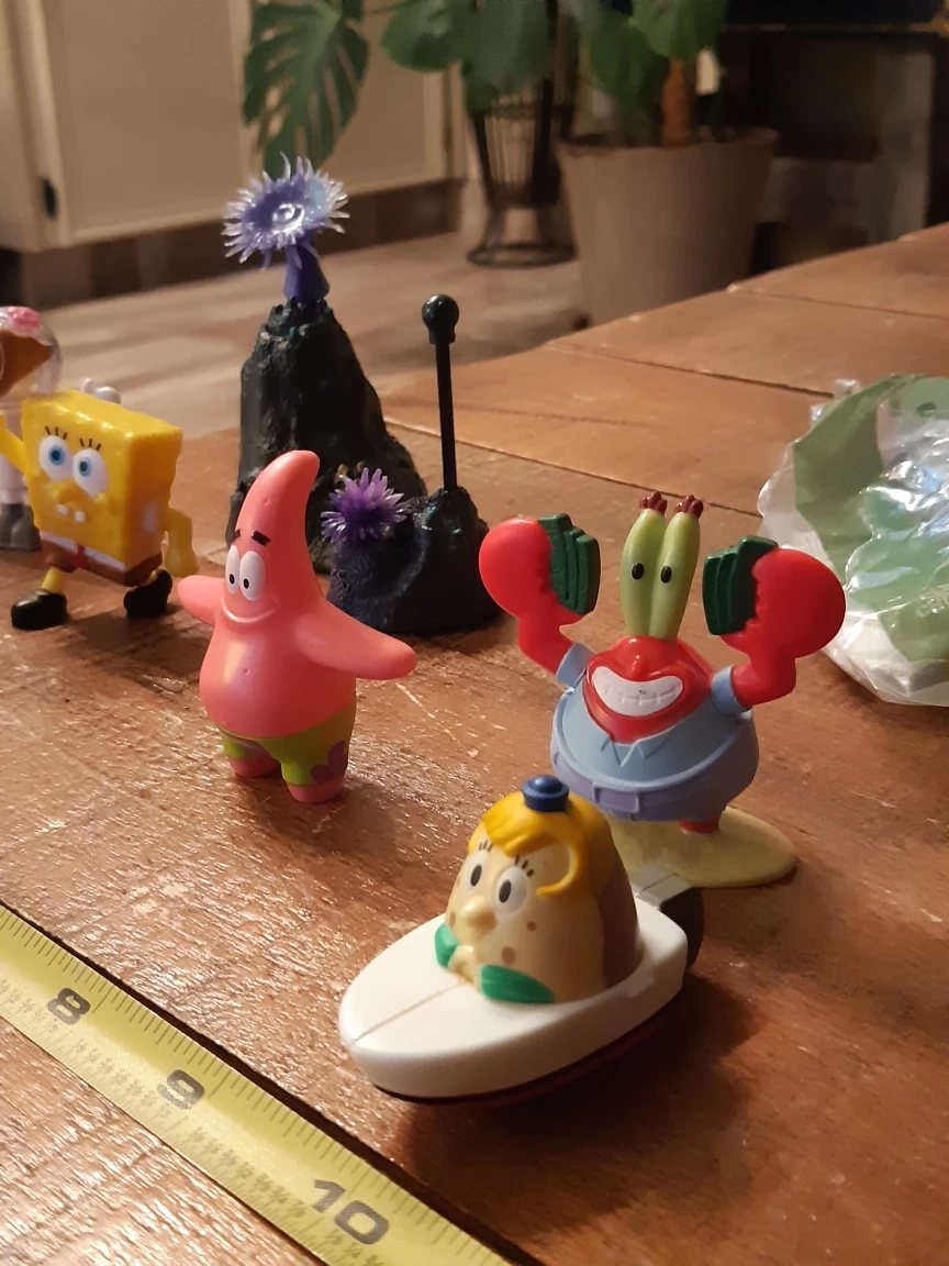 Spongebob, sandy, Gary, mr. Crabs, ms. Puff, Patrick, and unopened Plankton. + matching light up background piece. 8 different figures/pieces.