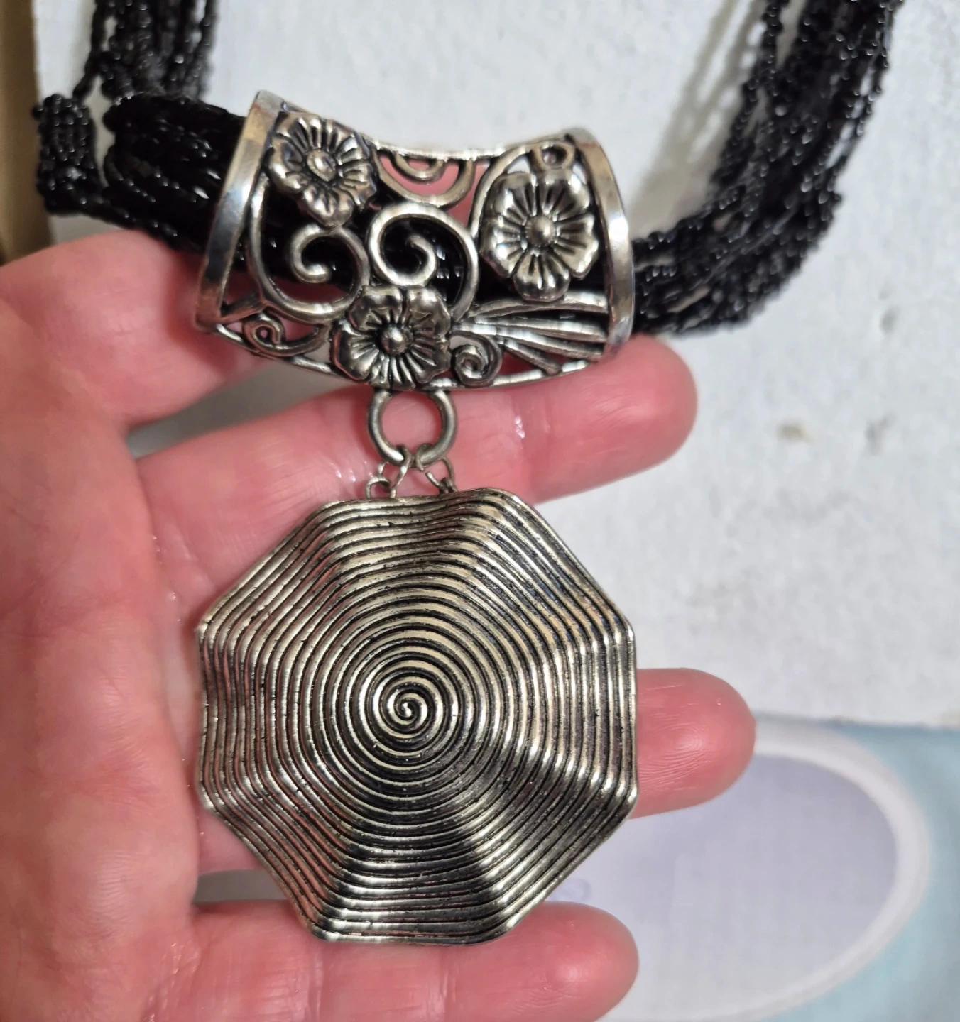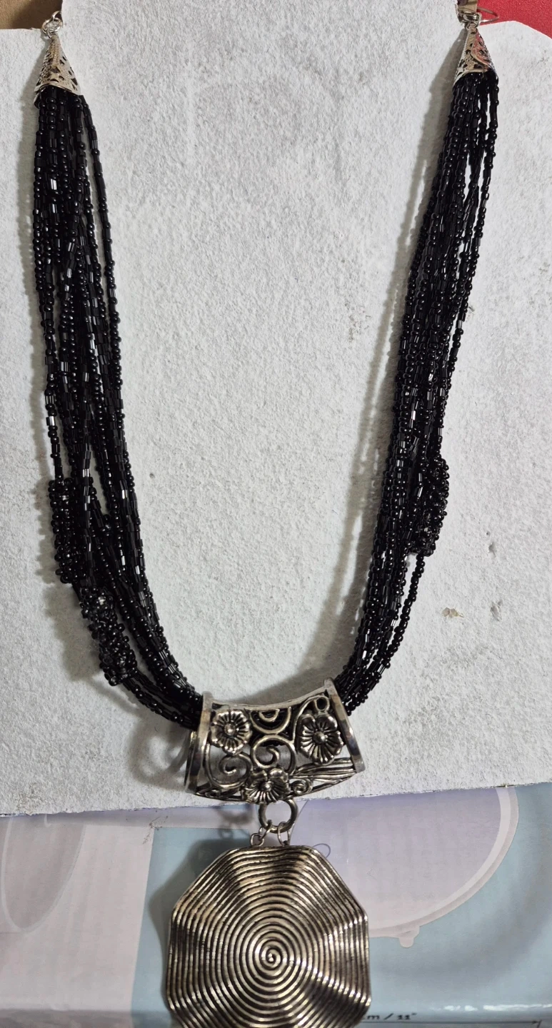 This multi-strand black beaded necklace features a decorative silver-tone centrepiece with a spiral pendant. The clasp is a magnetic closure for easy wear. It's a statement piece perfect for dressing up an outfit.