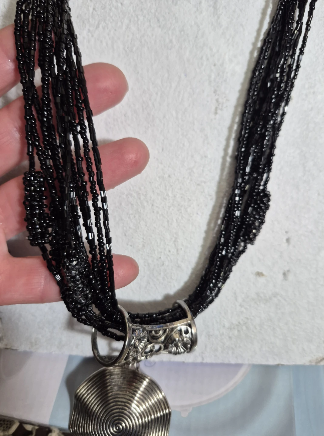 This multi-strand black beaded necklace features a decorative silver-tone centrepiece with a spiral pendant. The clasp is a magnetic closure for easy wear. It's a statement piece perfect for dressing up an outfit.