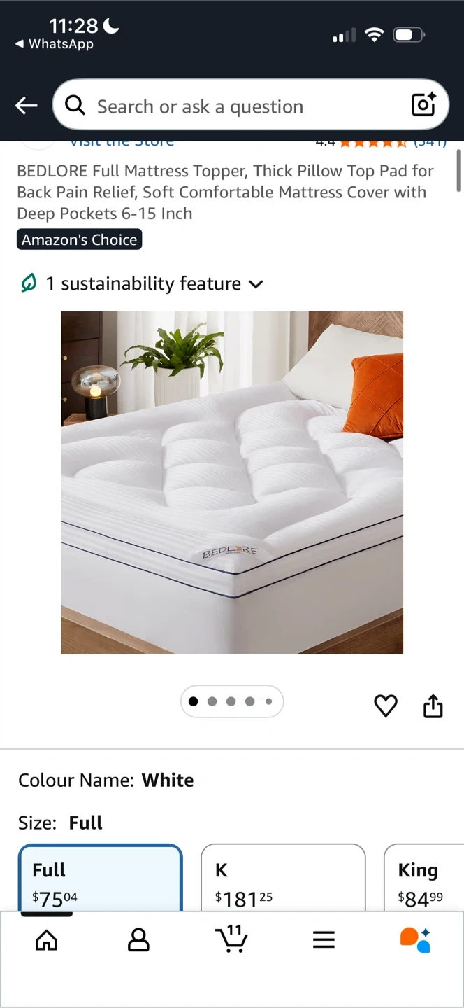 This is a BEDLORE Full mattress topper in white. It's a thick pillow-top pad designed for comfort. Features deep pockets for a secure fit on mattresses 6-15 inches thick.