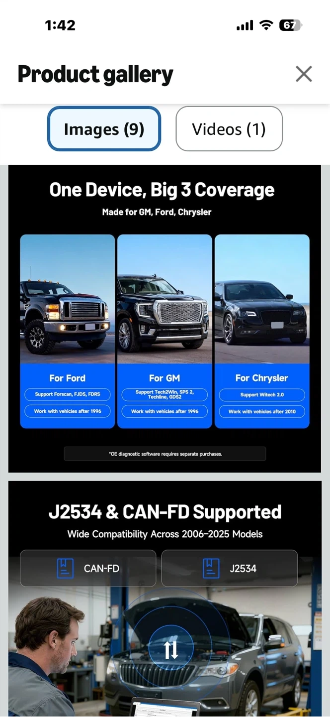 TOPDON RLink X3 OBD2 Adapter for GM, Ford, and Chrysler vehicles. Supports J2534 and CAN-FD protocols. Works with vehicles made after 1996 for GM, and after 2010 for Chrysler. Open box