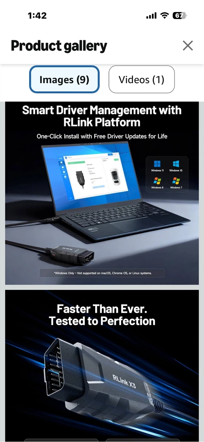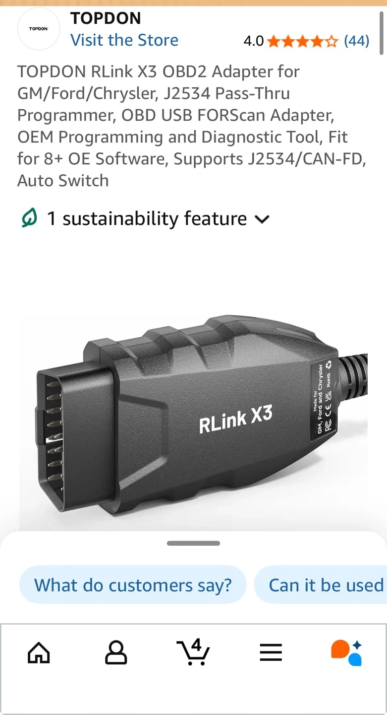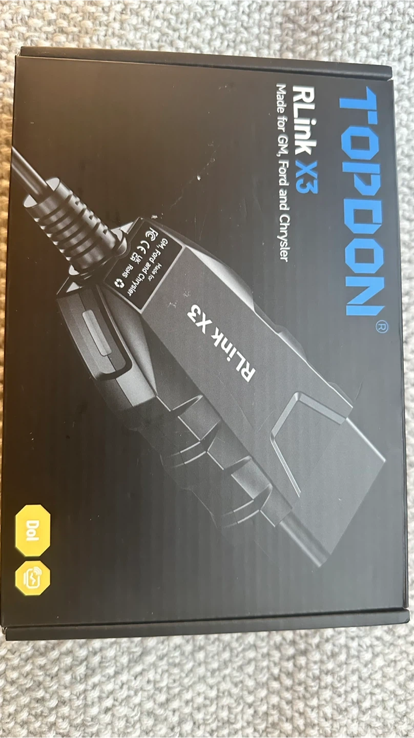 TOPDON RLink X3 OBD2 Adapter for GM, Ford, and Chrysler vehicles. Supports J2534 and CAN-FD protocols. Works with vehicles made after 1996 for GM, and after 2010 for Chrysler. Open box