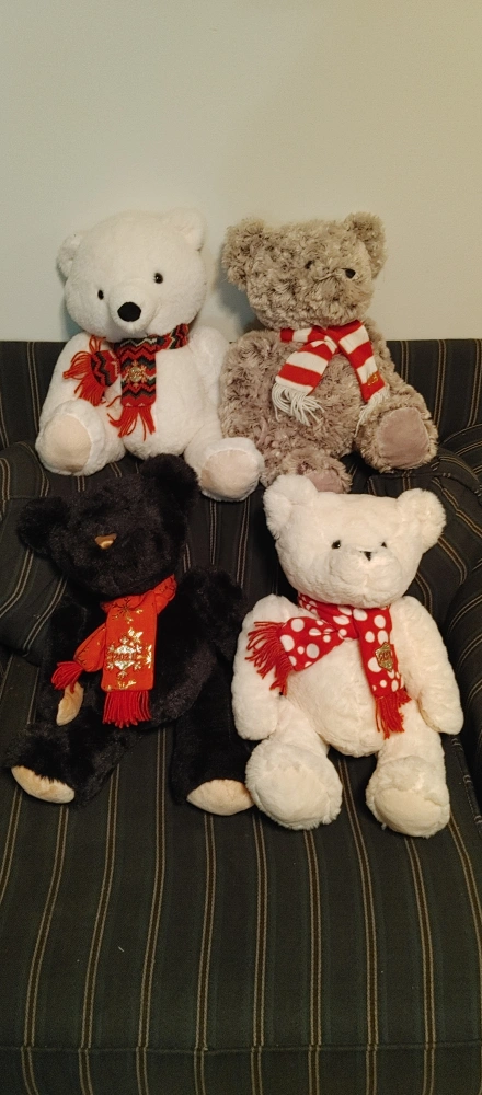 Selling these four adorable plush teddy bears! They each have their own unique scarf. They're in great condition and ready for a new home