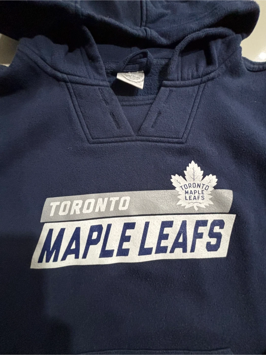 Selling a Toronto Maple Leafs hoodie. It's a size L (10/12) and made of 65% polyester and 35% cotton. The hoodie is in great shape and features the classic Maple Leafs logo. Perfect for any young fan!