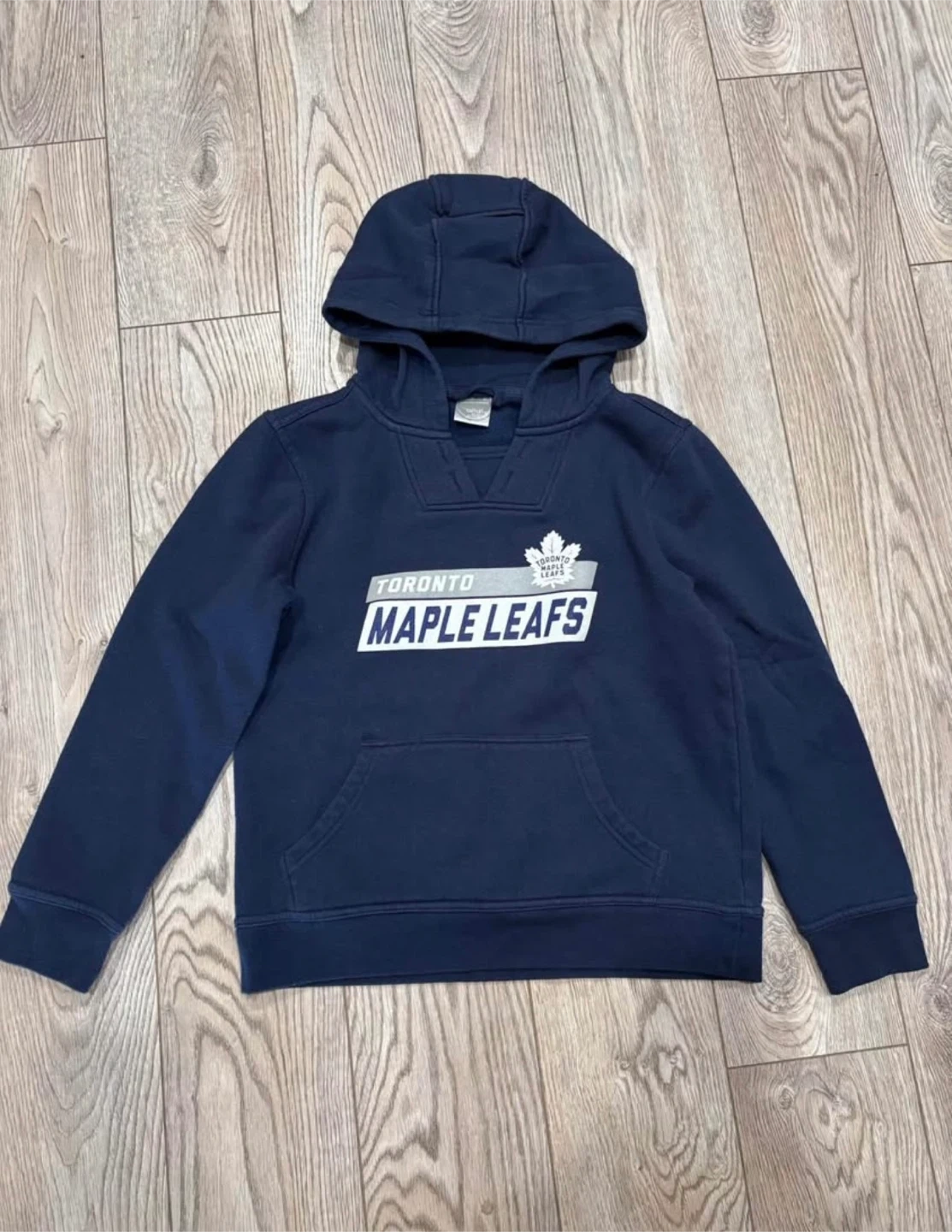 Selling a Toronto Maple Leafs hoodie. It's a size L (10/12) and made of 65% polyester and 35% cotton. The hoodie is in great shape and features the classic Maple Leafs logo. Perfect for any young fan!